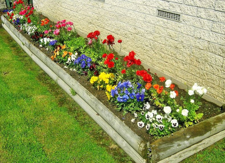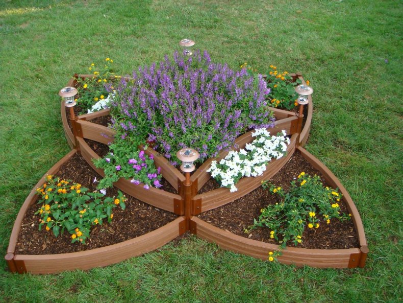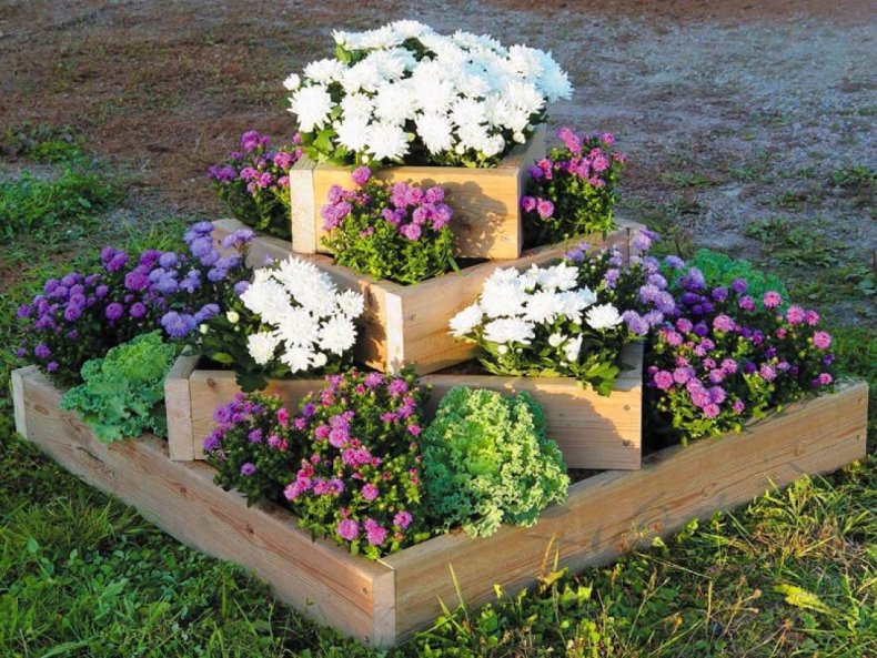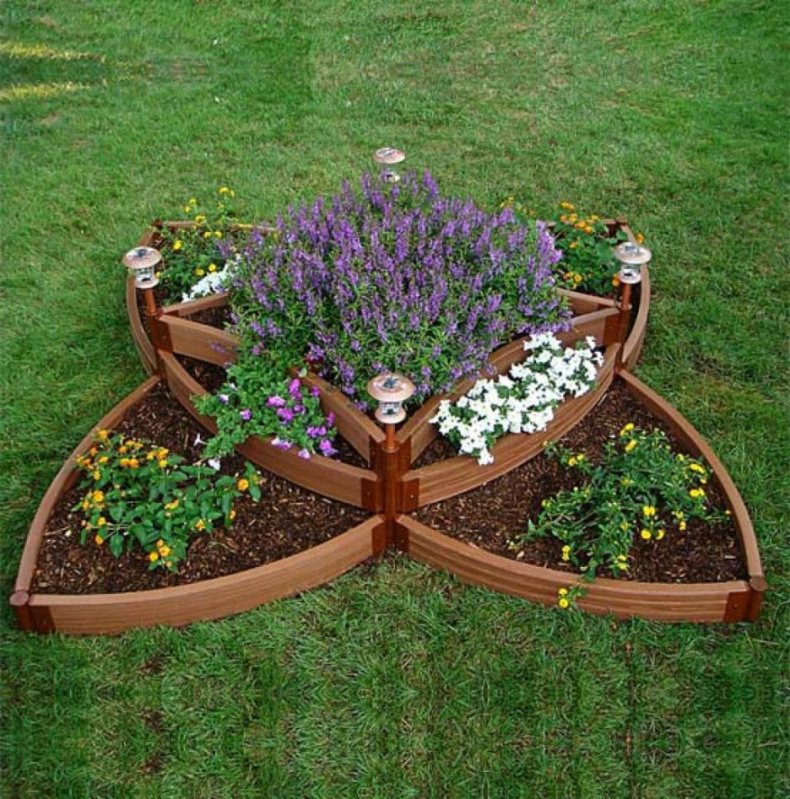 По форме бывают круглыми, прямоугольными, квадратными, либо в виде фигуры. На дно клумбы можно постелить спанбонд, как защиту от сорняков.