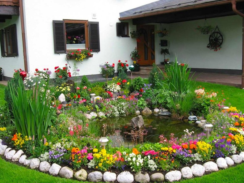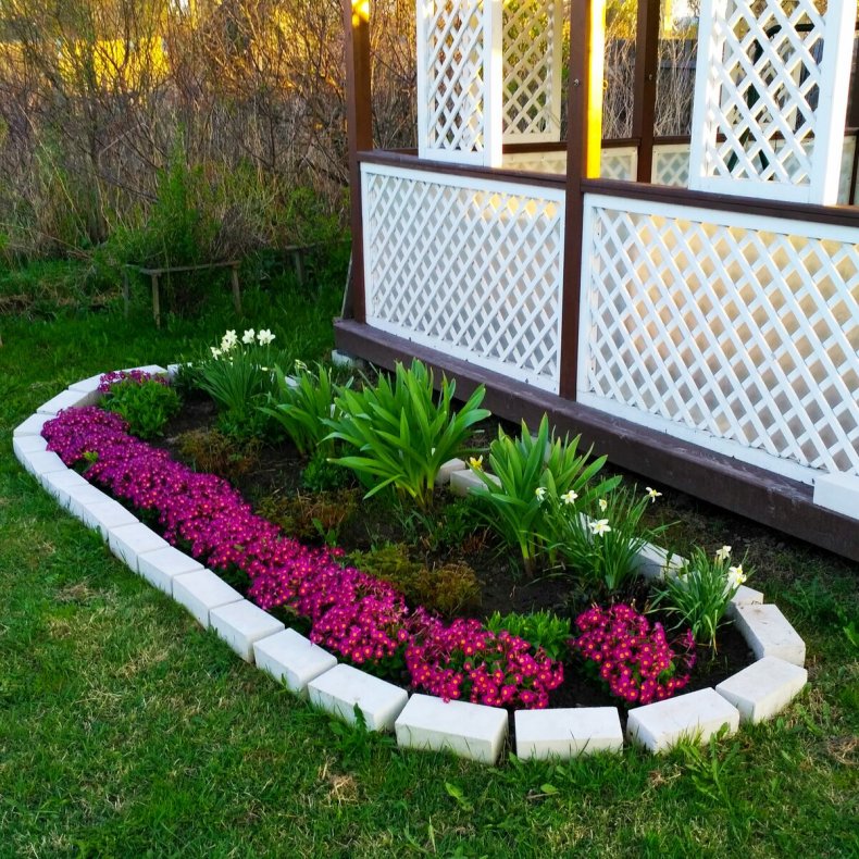 Декоративная клумба станет отличным украшением дачного домика. Важно только помнить о сочетаемости цветов и долговечности материалов для оформления.