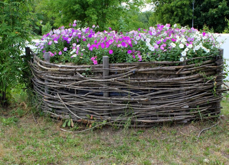 Клумбы также можно изготавливать из огромнейшего количества предметов быта. В ход идёт всё – от покрышек до пластиковых бутылок. Часто у хозяев остаётся много ненужных вещей и при достаточной фантазии их всех можно превратить в красивую ограду для клумбы.