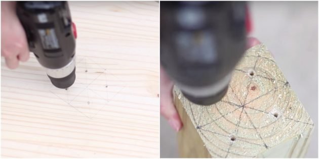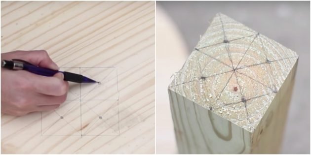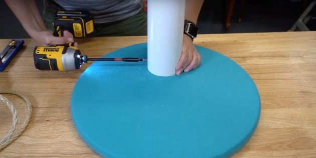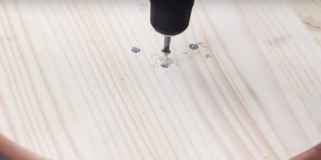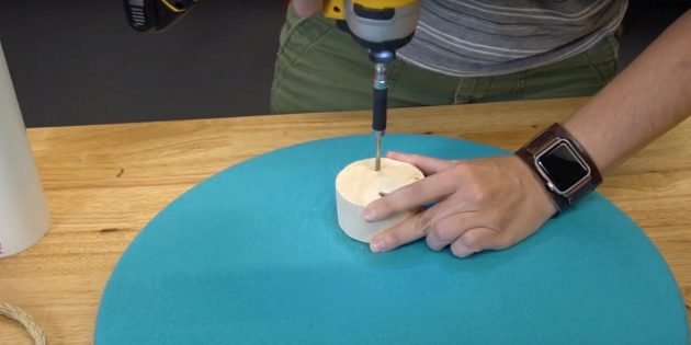 Сначала нужно отметить центральную точку на основании, при помощи саморезов прикрепить к нему брусок.