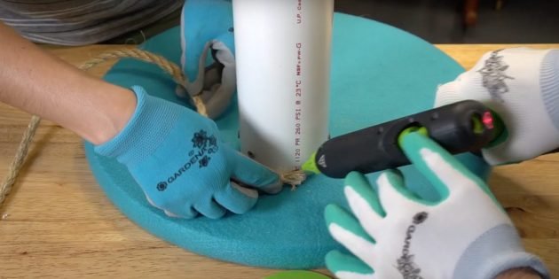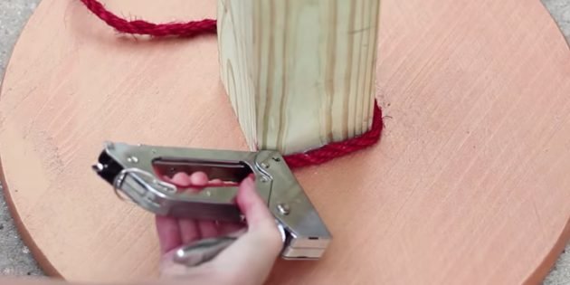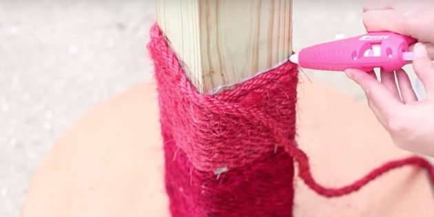 - С самого низа нанести горячий клей, плотно, прижимая веревку к бруску, прикрепить по всей длине.
