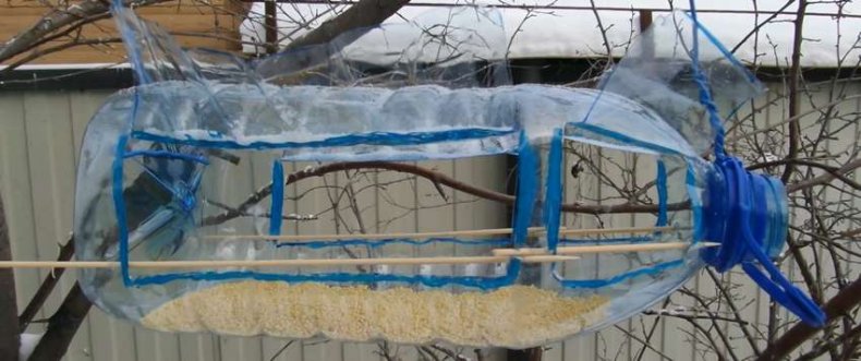 Сегодня этим гуманитарным мероприятием занимаются преимущественно самоделкины и добрые люди. Именно они додумались кормить птичек с помощью кормушек из пластиковых бутылок.