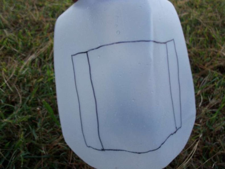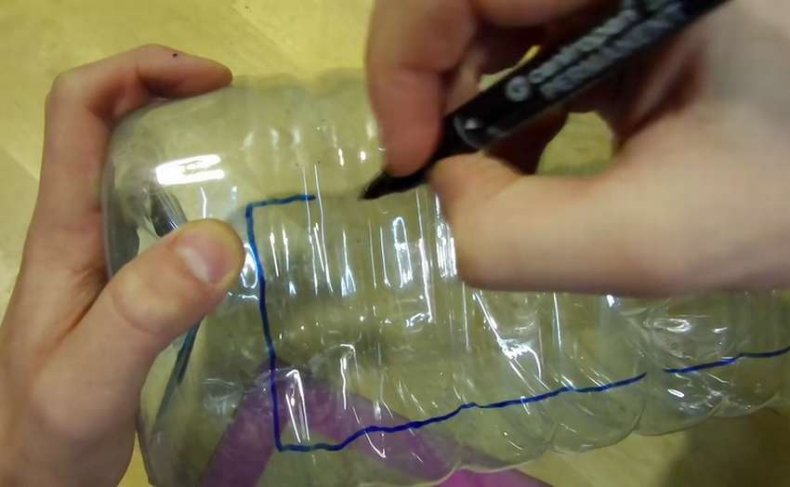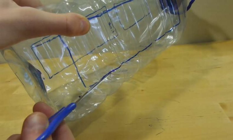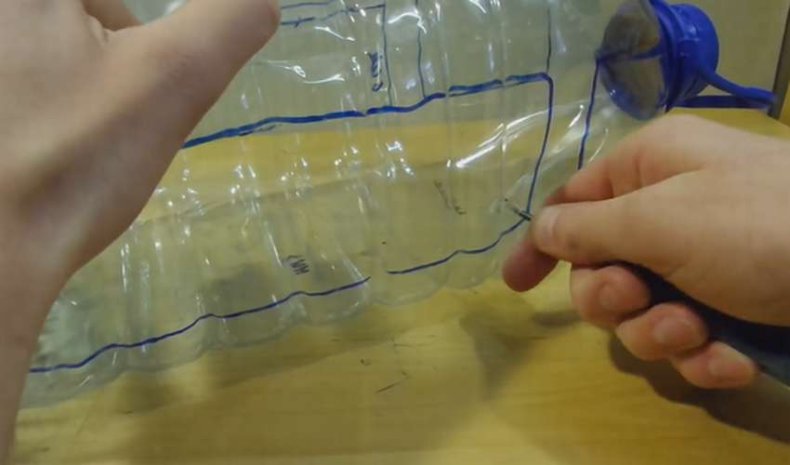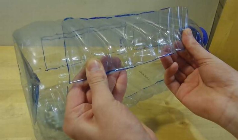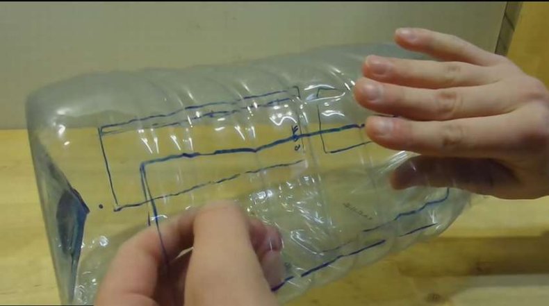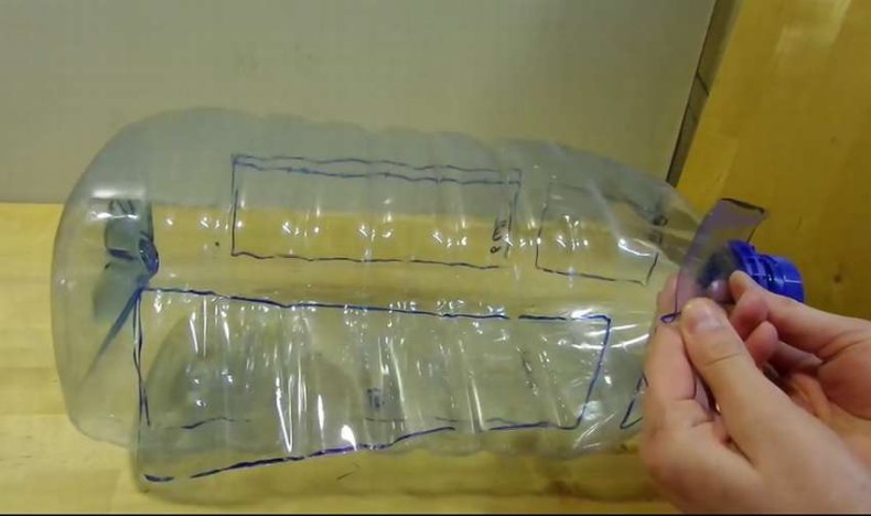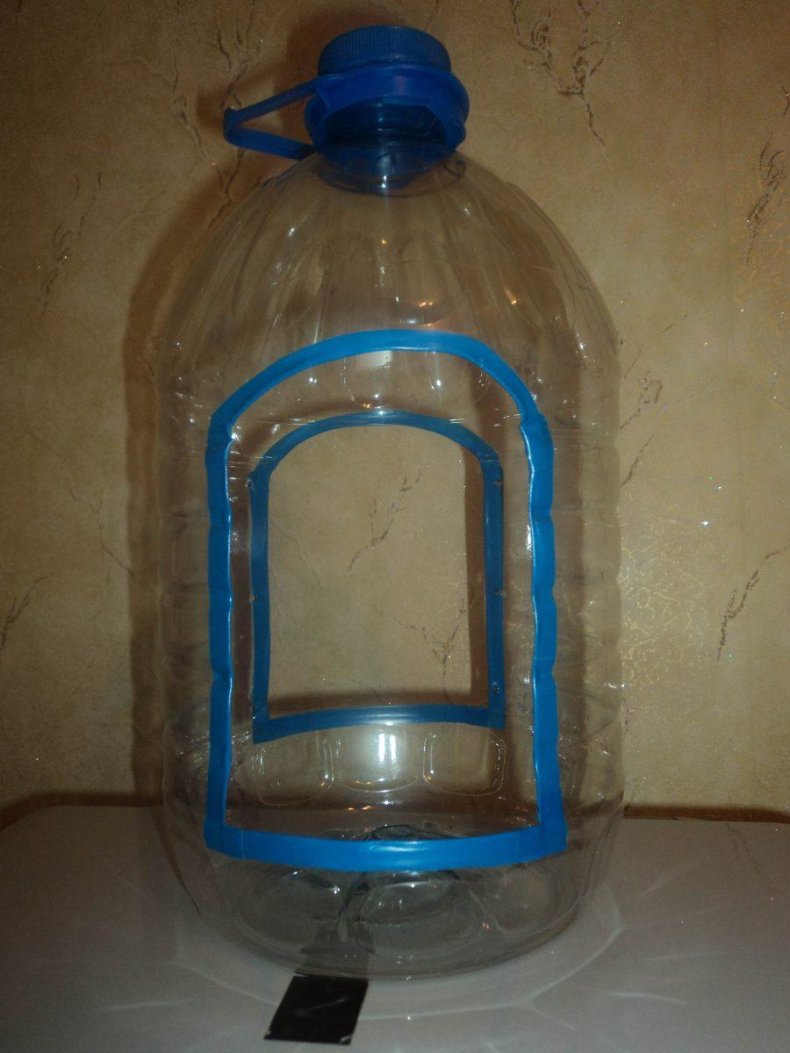 - В баклажке с одной-трех сторон срезаются проемы размером 14х14, 12х16 или 14х18 см (заготовка может находиться в вертикальном или горизонтальном положении);