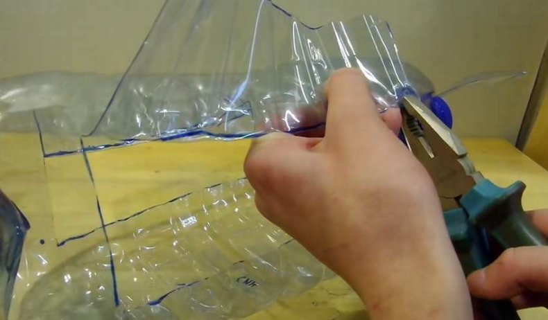 - В трех-шести бутылках надо вырезать по одному вертикальному проему размером 14х16 см;