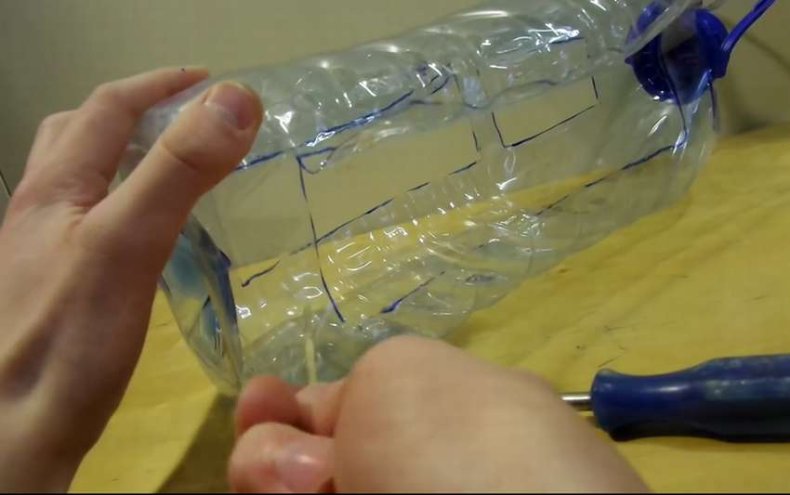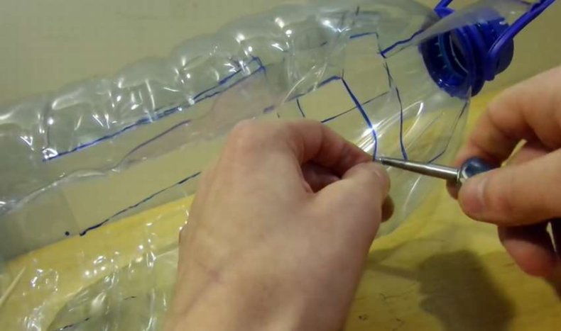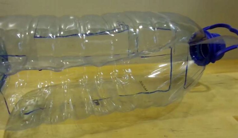 - Над дном 0,5-1,5-литровой бутылки срезаются 3-4 проема размером 2х2 см;