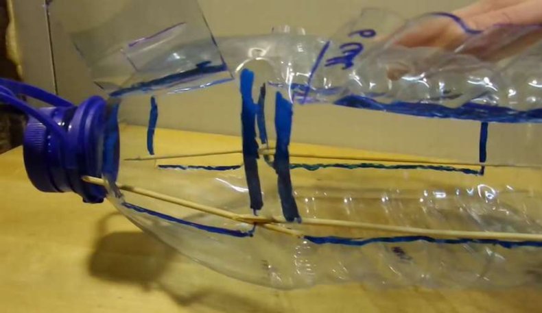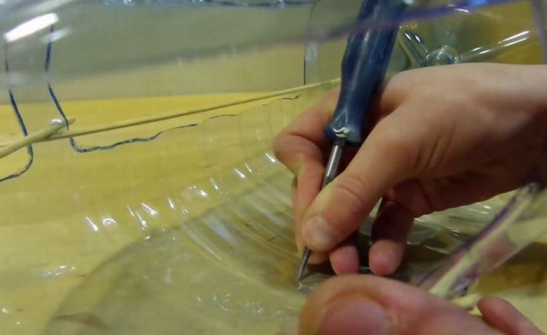 - В бутылке надо проделать два отверстия таким образом, чтобы они смотрели в разные стороны и при этом находились на разном уровне;