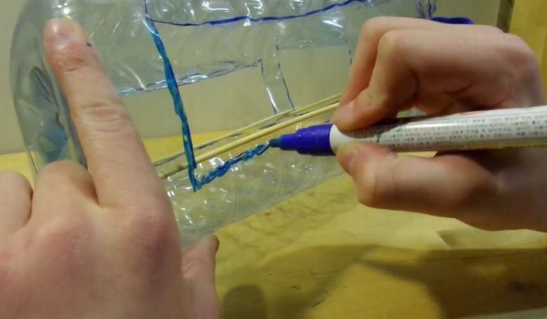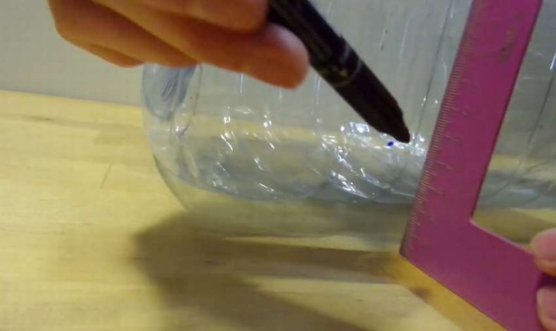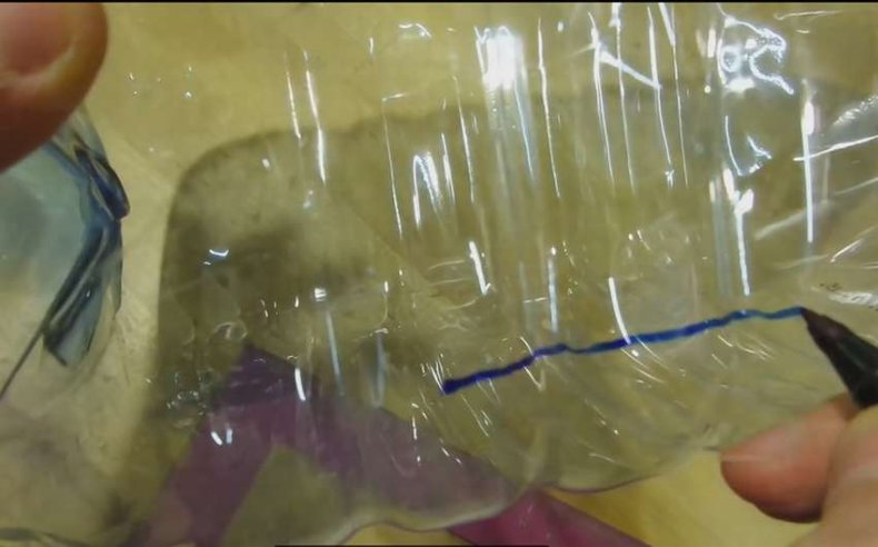- Сначала бутылку надо просунуть горлом вниз через кольцо, чтобы замерить глубину будущей «воронки» (линия чертится на 5-8 см выше кольца);