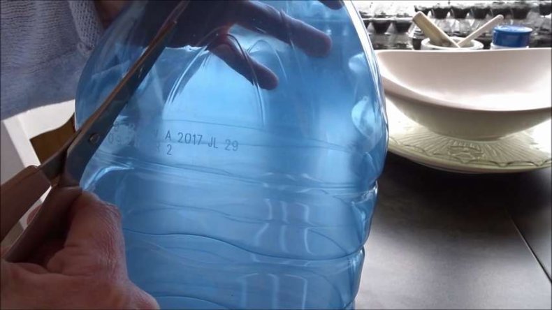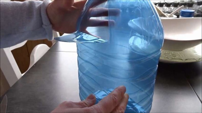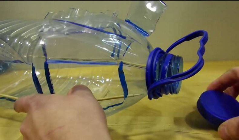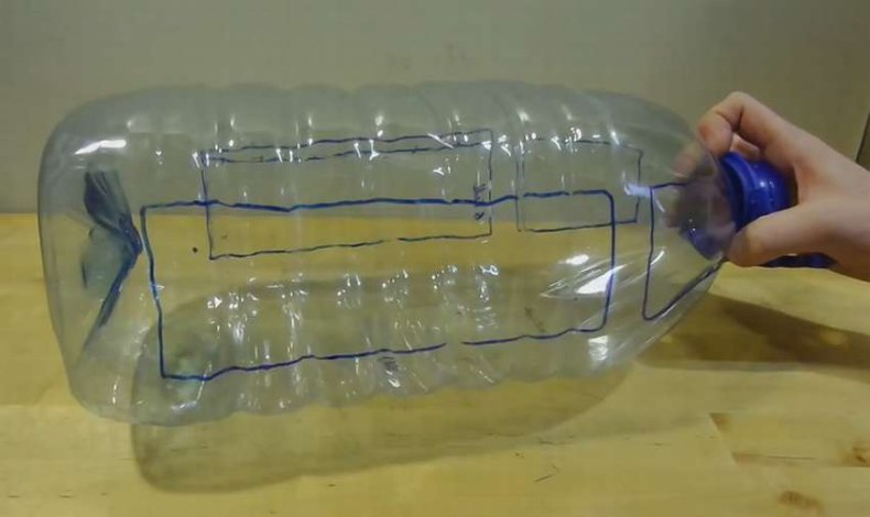 - В 5-6-литровой бутылке разрезается отверстие для прохода горлышка и плечиков другой бутылки;