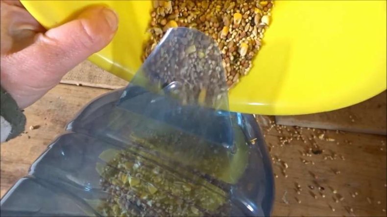Если корм мелкий, то горлышко загрузочной бутылки перед погружением закрывается крышкой с 6-8-миллиметровыми отверстиями.
