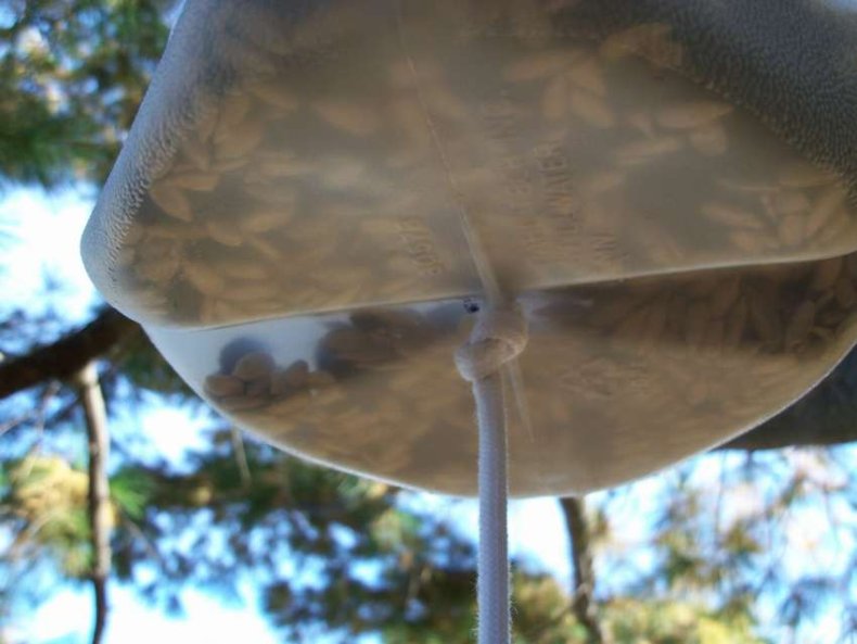 Такую кормушку надо подвешивать в вертикальном положении или ставить на пень. Птички не смогут залезать внутрь бутылки, но и корм останется сухим и съедобным до тех пор, пока не будет съеден.