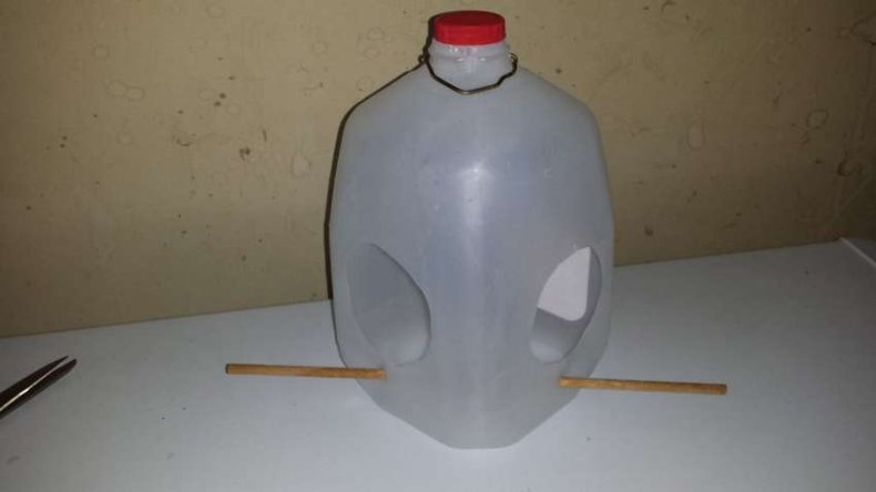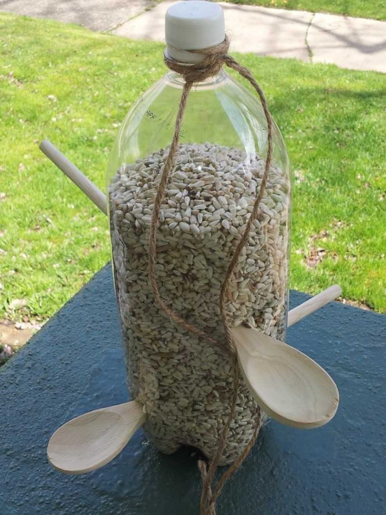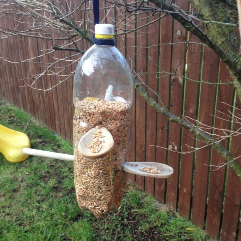 Небольшая пластиковая бутылка всегда найдется. А если вместе с ней обнаружены две изношенные деревянные или пластиковые ложки, то кормушка с самопроизвольной подачей корма почти готова: