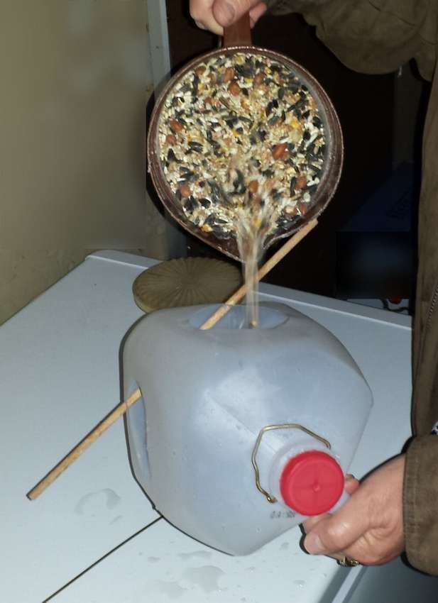 - Тара заполняется кормом через воронку, закрывается крышечкой и подвешивается на дерево.