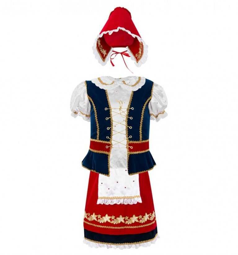 - Характерными цветами для этого костюма являются красный, белый и черный. Можно поиграть и другими тонами. Одинаково красиво будет смотреться юбка с жилетом серого зеленого или даже синего цвета, но узнаваемым образ будет только при наличии красной накидки или шапки.