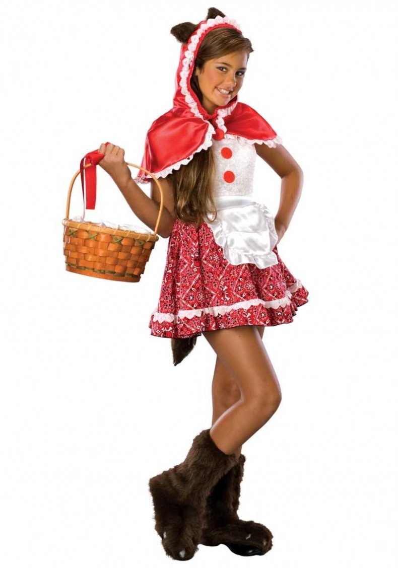 Дополнить образ можно колготками белого цвета, кружевными носочками или гольфами. Озорная Красная шапочка также может надеть полосатые гетры.