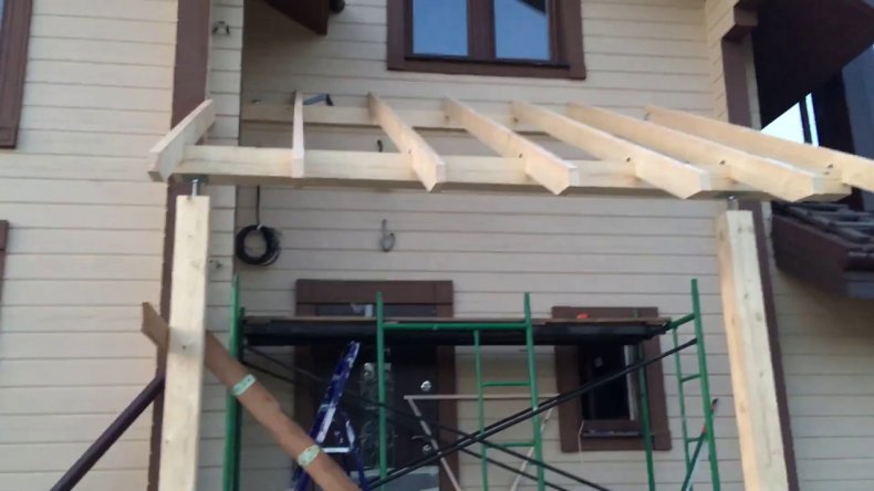 - Дополнительные подборки необходимы. Обычно в их качестве применяют балки, которые располагаются по краям конструкции. Они должны подпирать выступающую часть козырька. К креплению балок выдвигают особые требования, потому что они должны выполнять не декоративную (хотя и это возможно) функцию, а задачу по укреплению козырька.