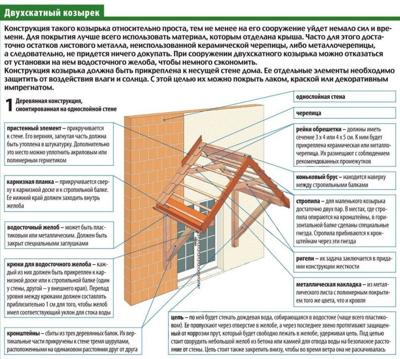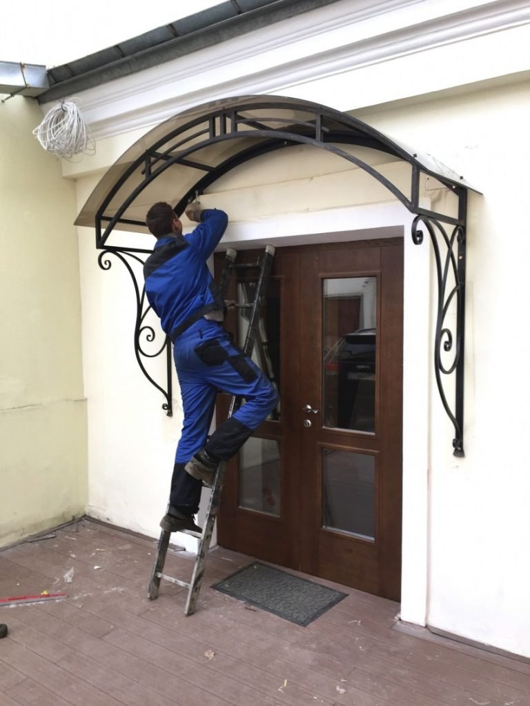 Также стоит отметить важный момент: Козырёк создаёт законченный вид конструкции. Необязательно приглашать специалистов. Часто работы можно проводить собственными силами. О нюансах написано далее.