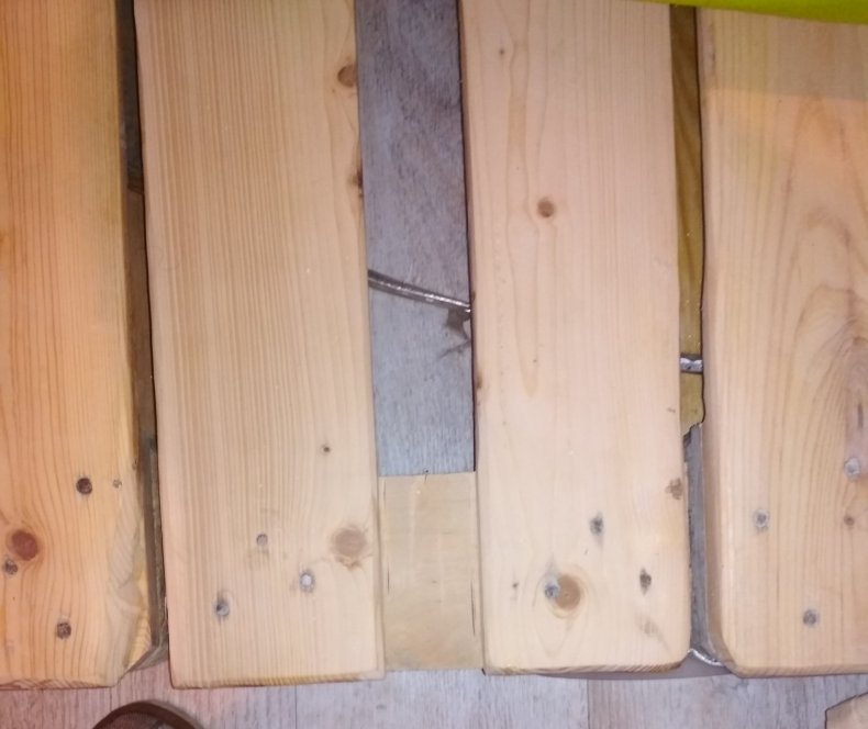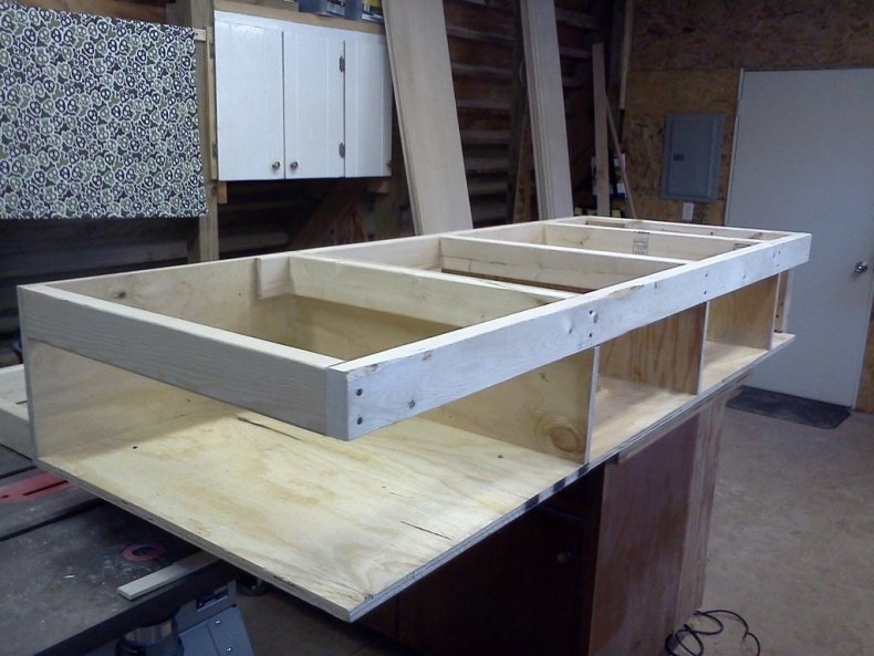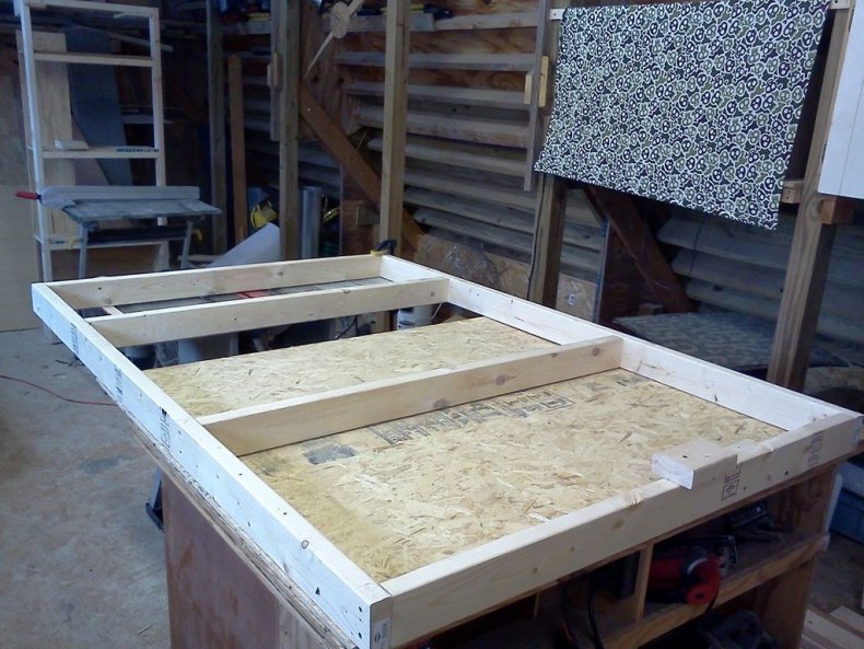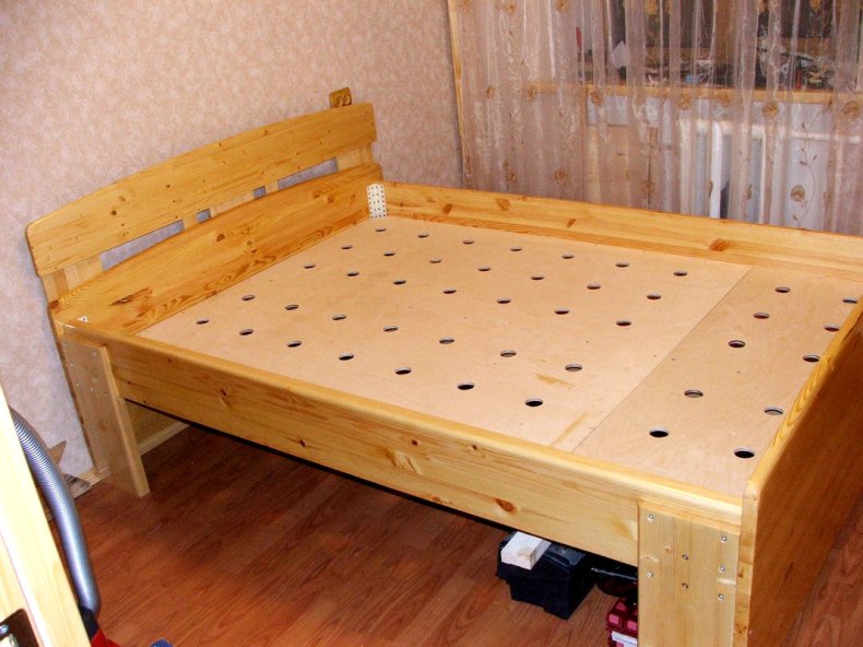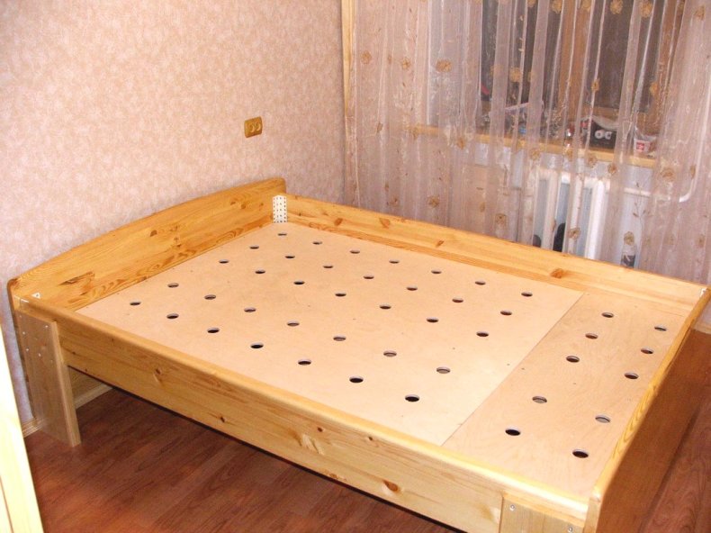 Поддон кровати делайте не сплошным, т.к. это может спровоцировать ограничение в вентиляции, но также учитывайте, что очень огромные пробоины, будут создать деформацию матраца.