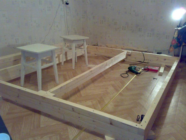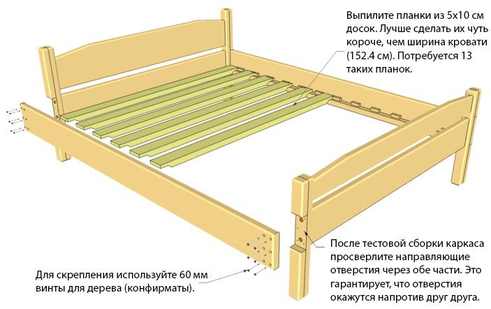 В случае, когда под рукой имеется минимум вспомогательных инструментов, а кровать рассчитывается в масштабах 200×160 см, имеются испробованные варианты установки.