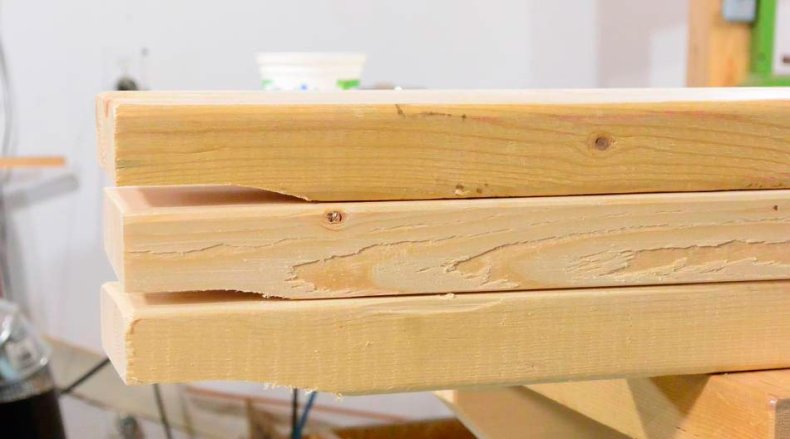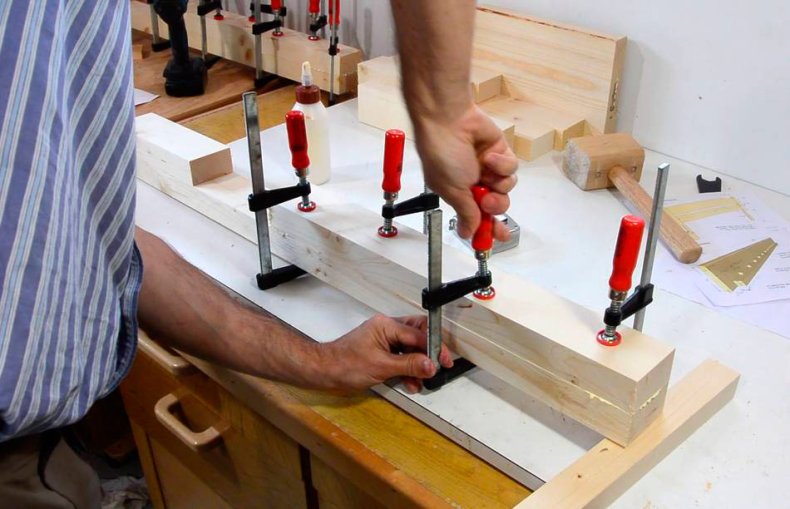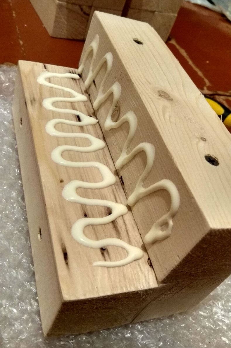 - Брусья первого слоя покрываются клеем, поверх улаживаются бруски второго ряда, стягиваясь саморезами.