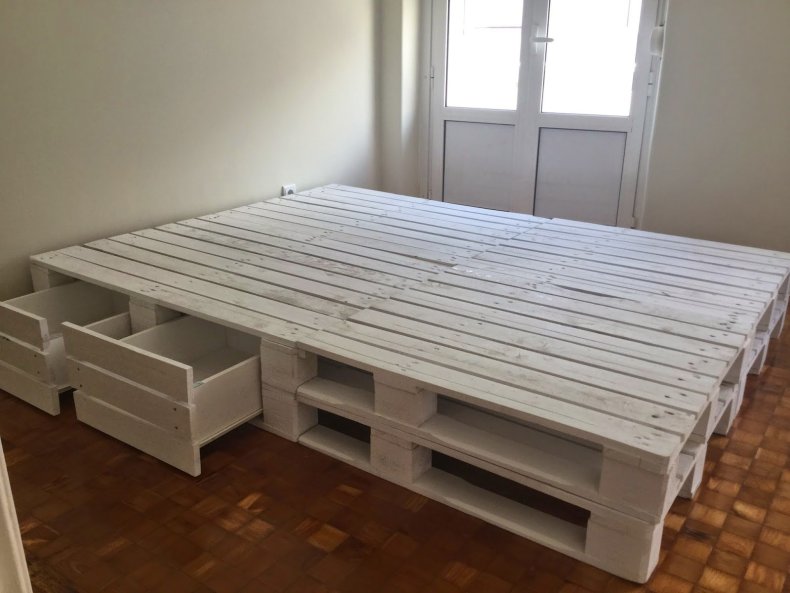 В общей сумме нам понадобиться восемь поддонов. Сборка кровати из поддонов это упрощенный и гармоничный стиль, который оправдает ваши ожидания.