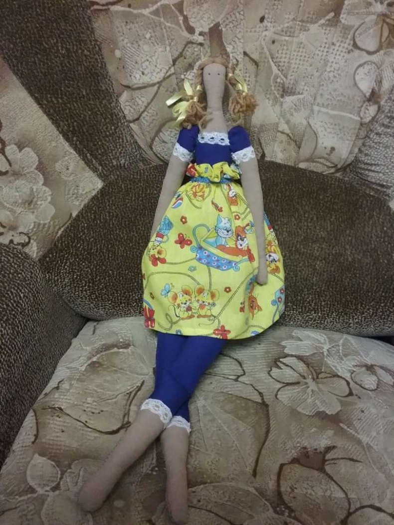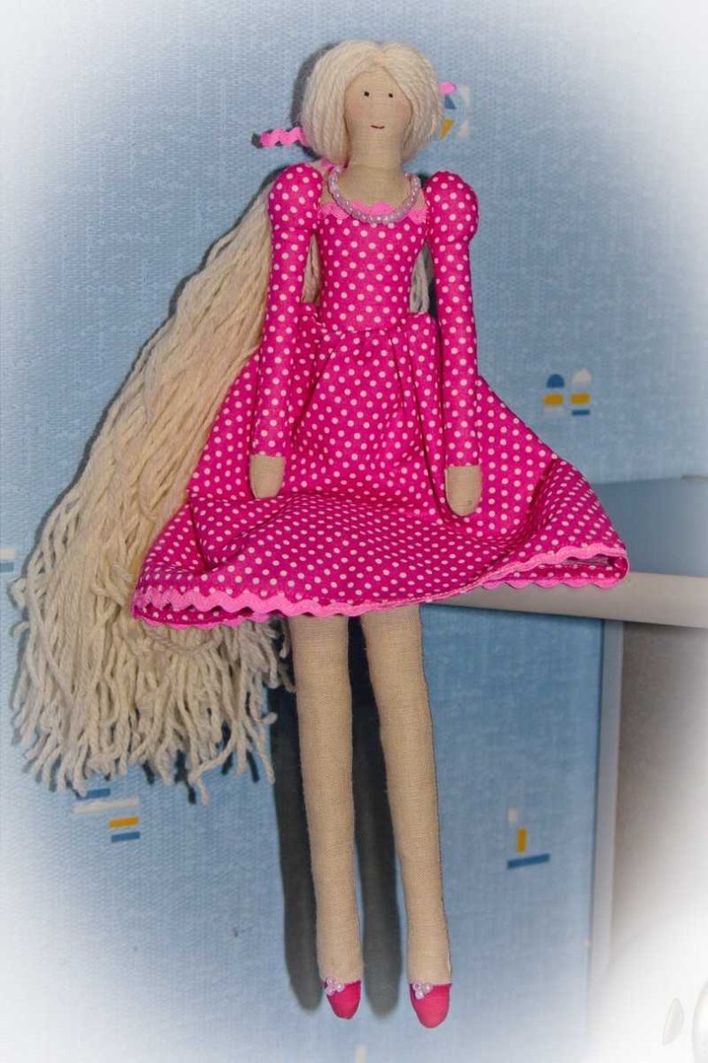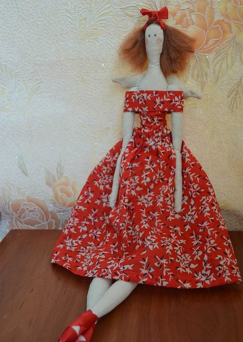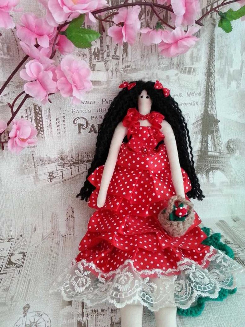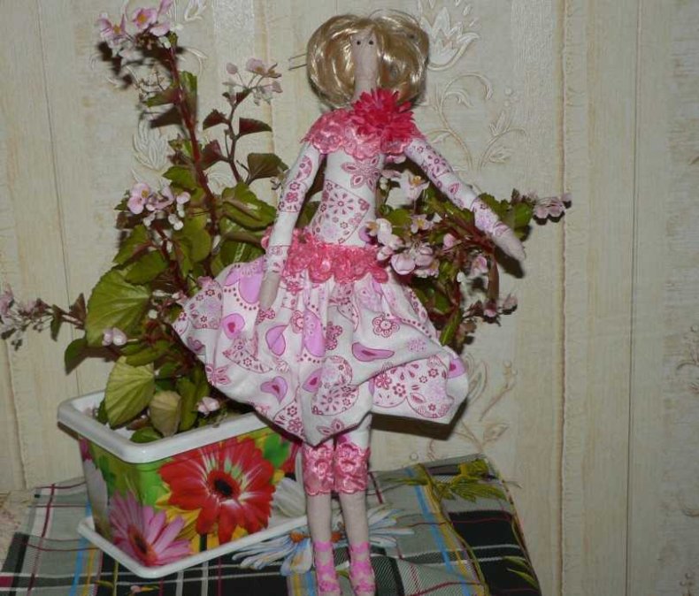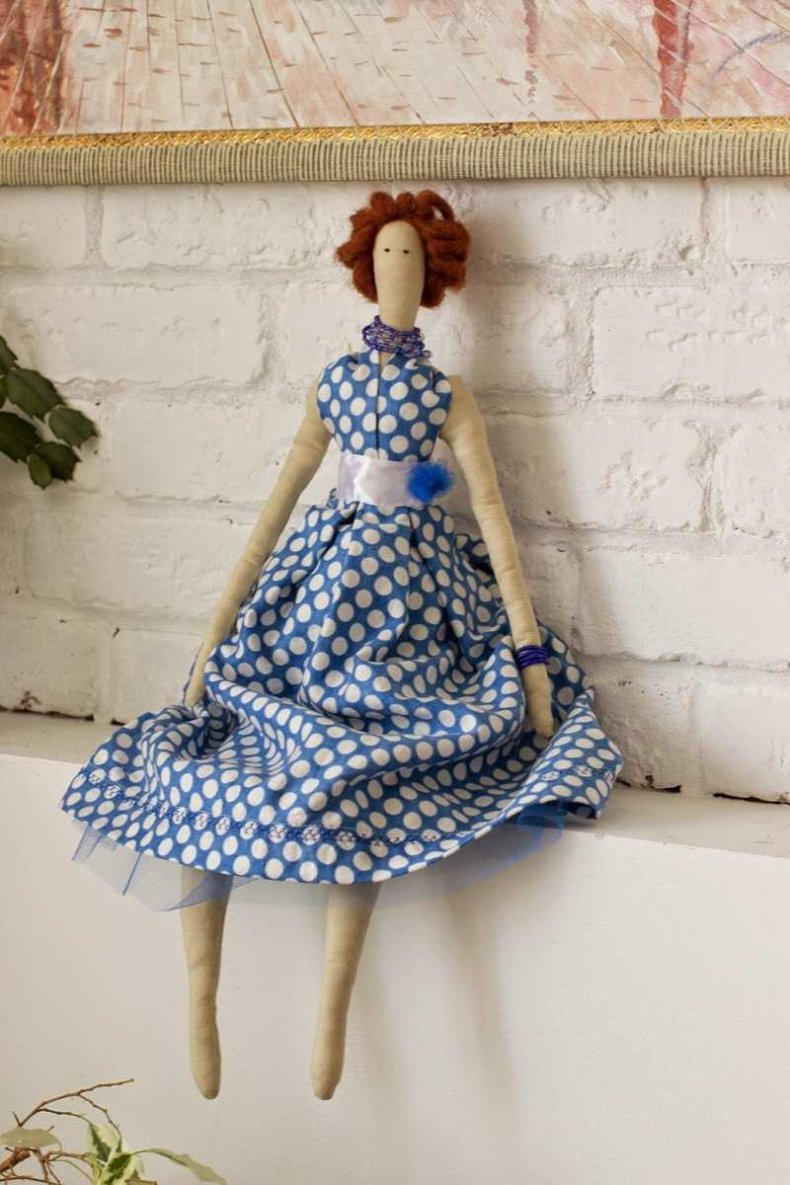 Тряпичная красавица представляет собой авторскую работу, которая гармонично вписывается в окружающую обстановку дома или квартиры.