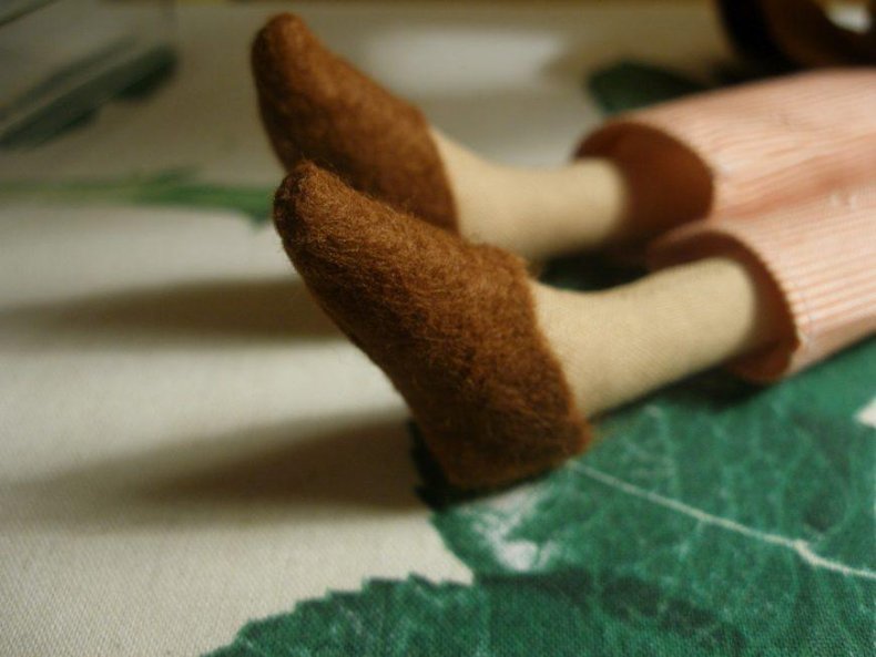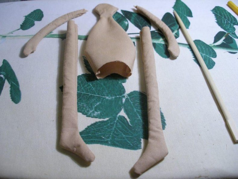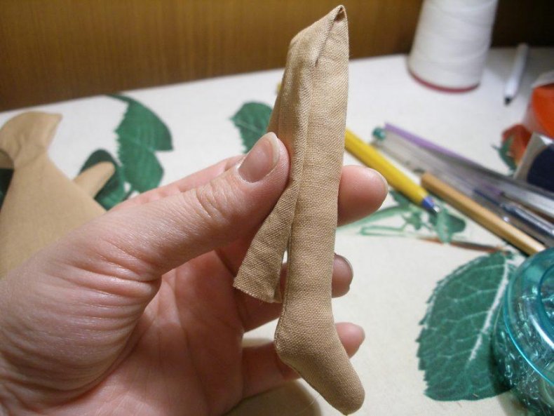 - Набить детали синтепоном. Чтобы ноги куклы сгибались, на уровне колен делают аккуратный горизонтальный шов.
