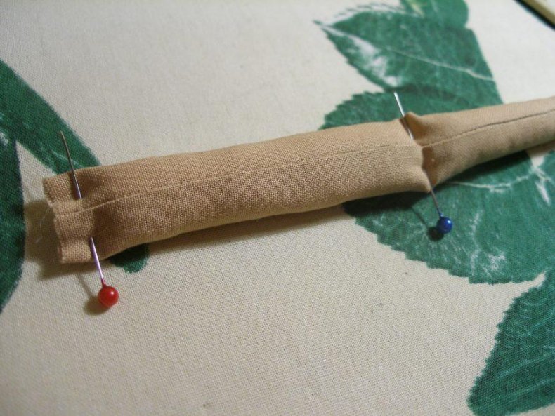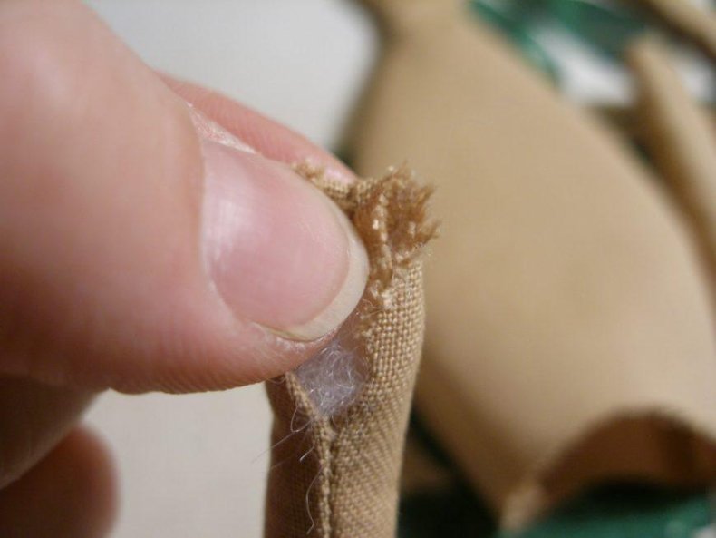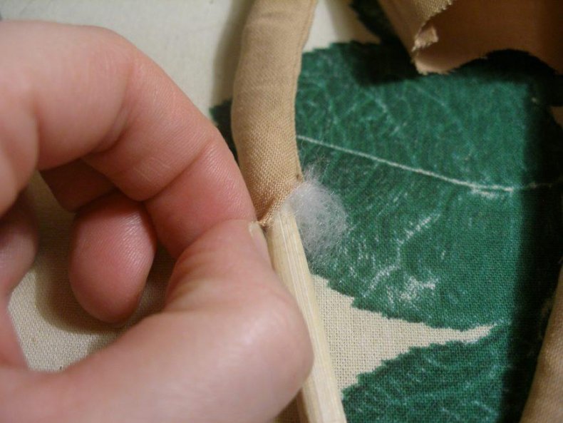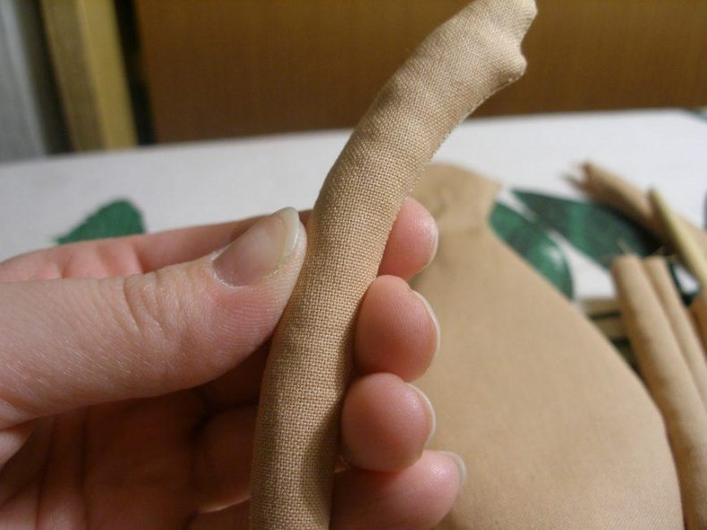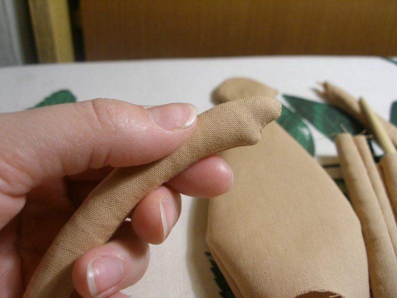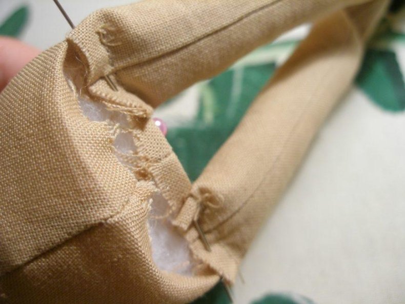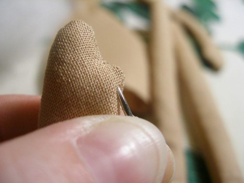 - Выворачивать следует осторожно. При возможности использовать тупой предмет, особенно там, где тяжело выворачивать ткань. Набивать детали синтетическим пухом или это может быть любой другой наполнитель, имеющий рыхлую структуру. Для сгиба в коленках делают горизонтальный шов.