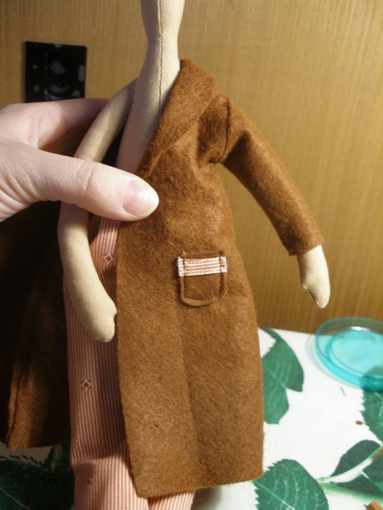 - Подшить нижний край туловища, одновременно с этим вшивая ноги. Руки примётываются потайным швом.