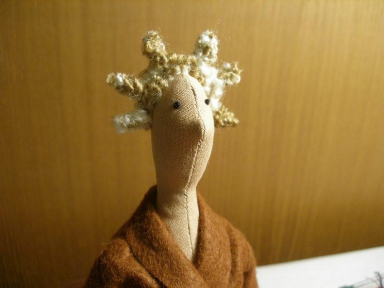 - Существует несколько вариантов причёски Тильды: это могут быть либо волосы, собранные в хвост, либо просто заплетённые в одну или две косички, либо оставленные распущенными. Сперва нужно зафиксировать шевелюру на голове куклы, пришив по центральному пробору. После приступить к созданию желаемой причёски.