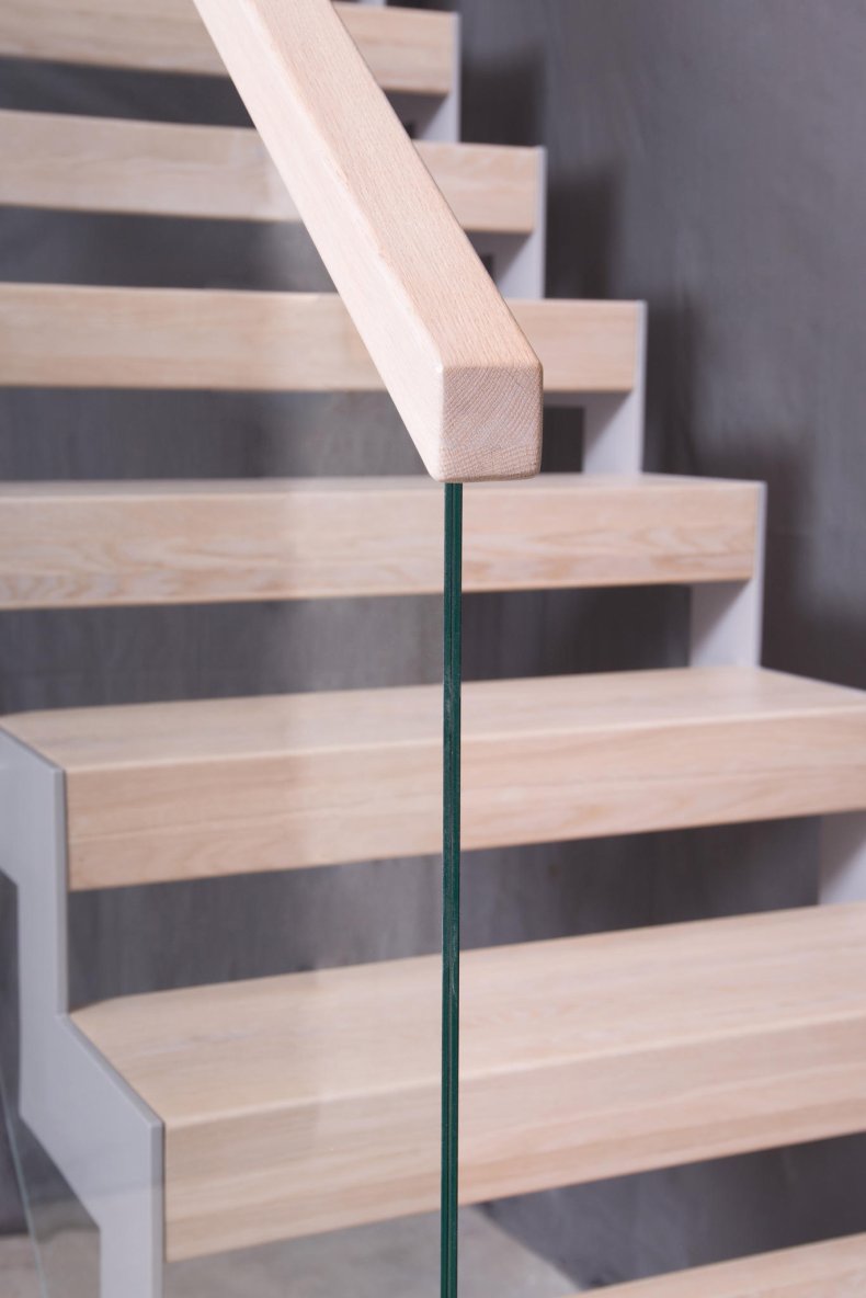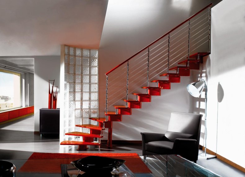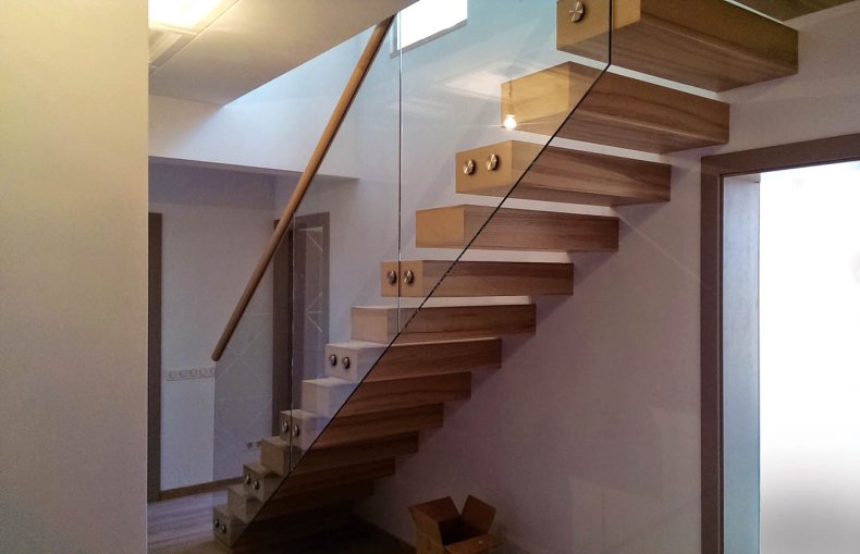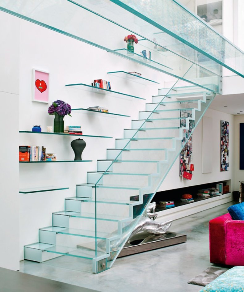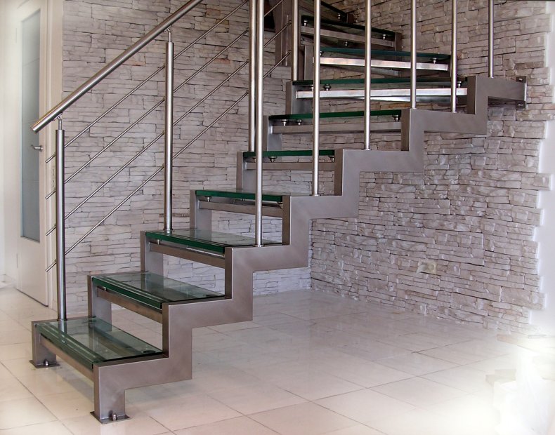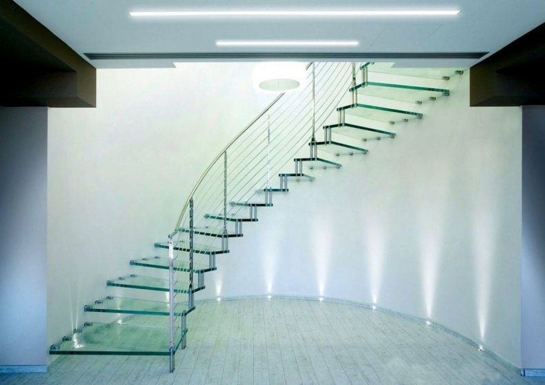 Этот материал придает легкости и воздушности внешнему виду лестничной конструкции. Достоинством является то, что прозрачное стекло не нужно подбирать к цветовой гамме интерьера.