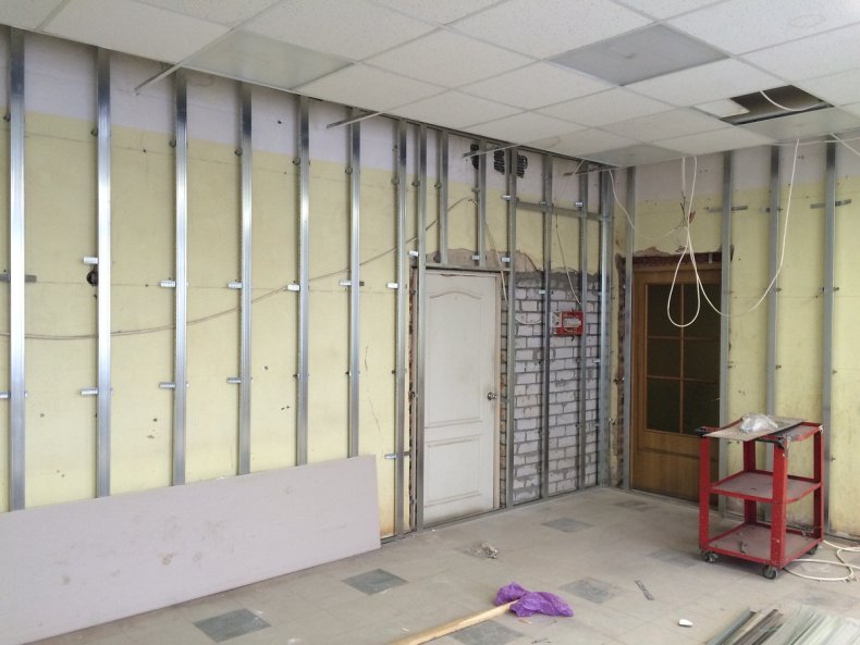 - Следующий шаг – монтаж гипсокартона на подготовленный профиль. Изготавливается пока только одна сторона стены, далее прокладывается слой звукоизоляции.