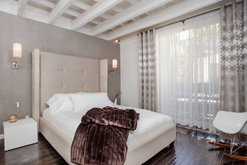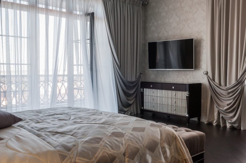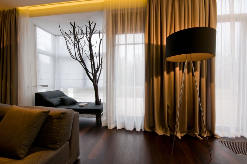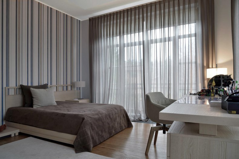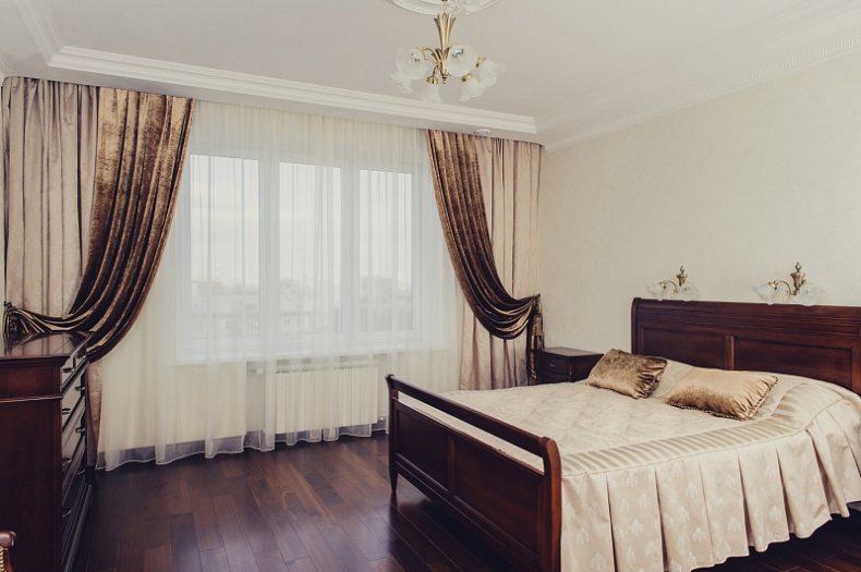 Предпочтение стоит отдать дорогим тканям, пусть это будет лен, бархат и шелк. В качестве защиты от солнца и посторонних глаз можно использовать жалюзи из натурального дерева. Этот теплый и природный материал как нельзя лучше наполнит комнату уютом.