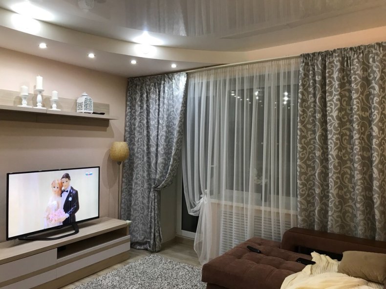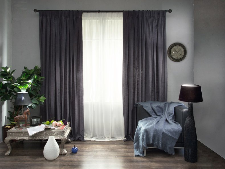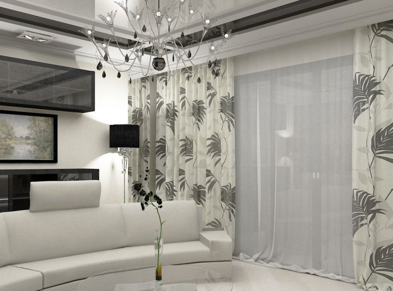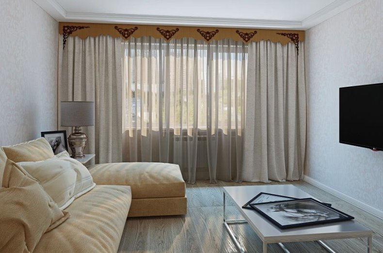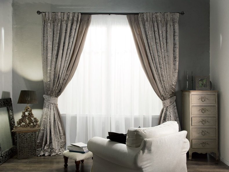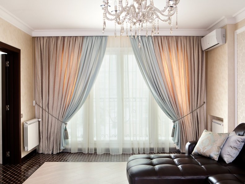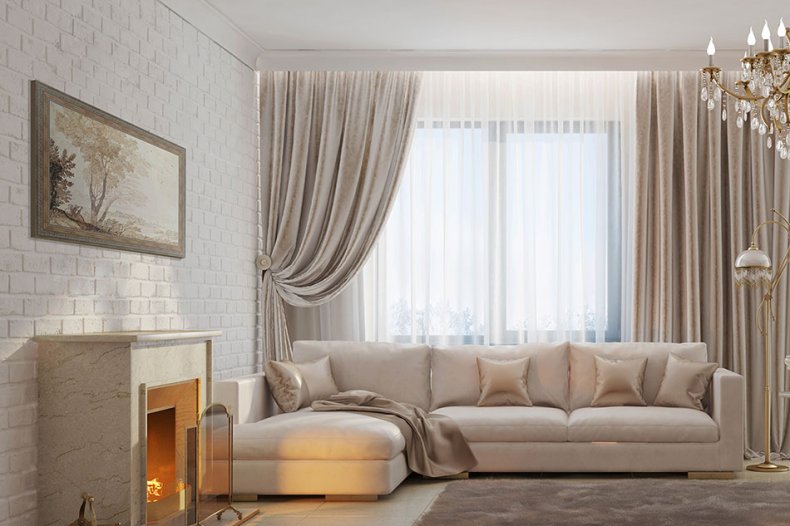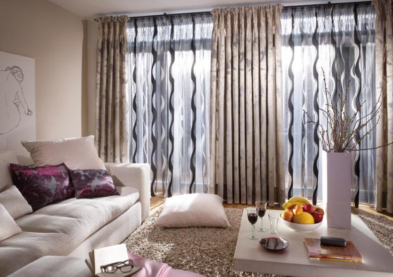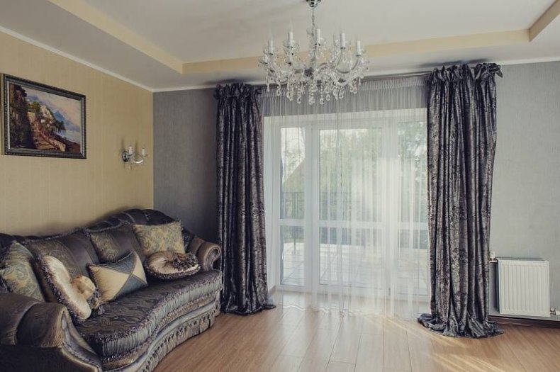 - Для гостиной следует выбирать дорогие, непрозрачные и тяжёлые материалы.