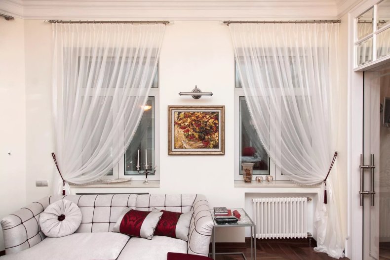 - Тюль белого цвета нарядно и в то же время стильно смотрится из натуральных тканей: хлопка или шелка.