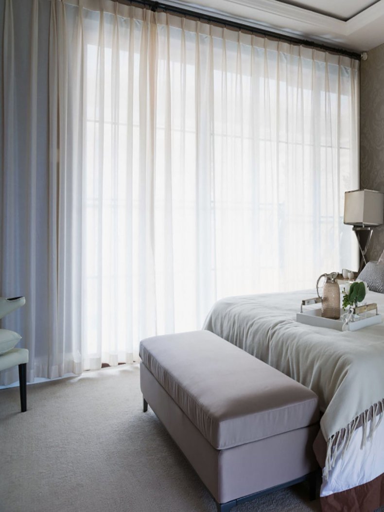 С помощью тюля в таком помещении можно создать расслабляющую и мягкую атмосферу.