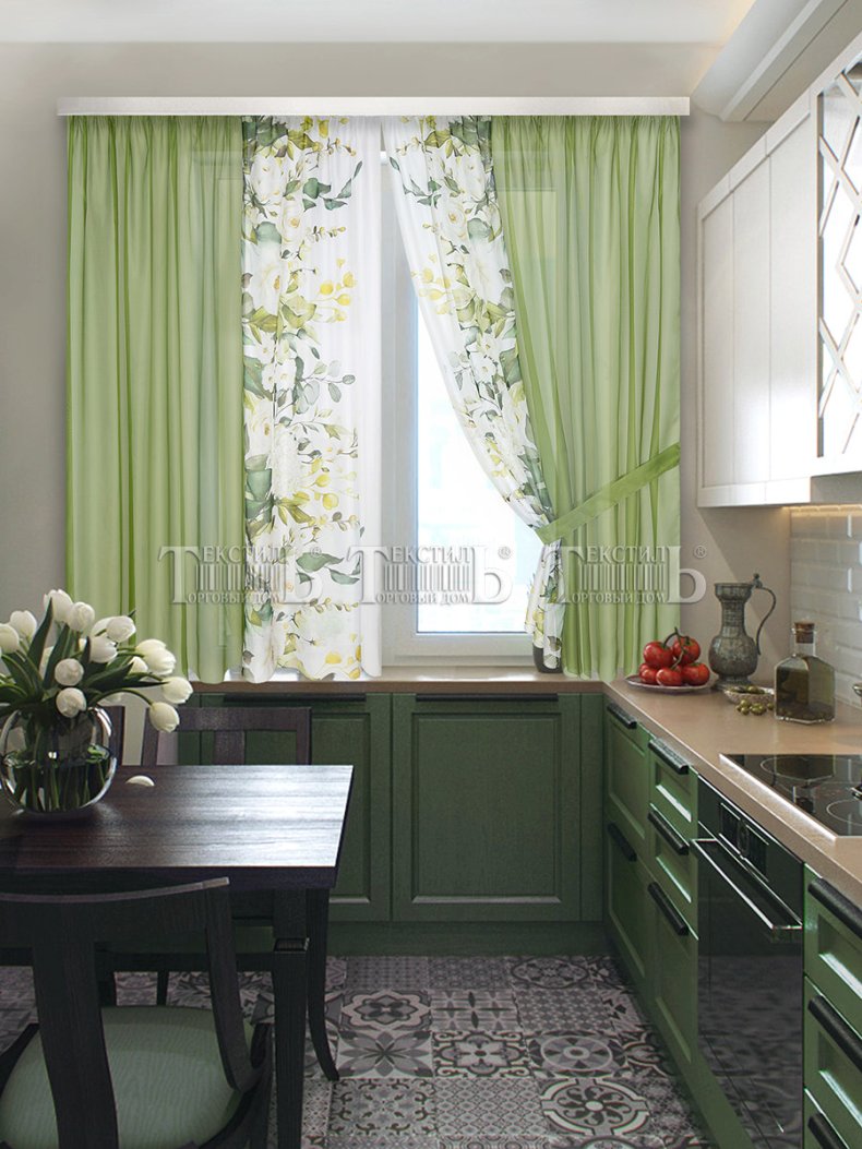 Для кухонного помещения идеально подойдет тюль лёгкой ткани. Так как в моде природность, то допустимо наличие принта: фрукты, овощи, бабочки, цветы или ягоды.