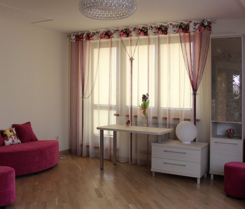 - Цвет тюля должен сочетаться с общим дизайном комнаты или с какими-либо предметами интерьера. Например, тюль можно подобрать под цвет дивана.