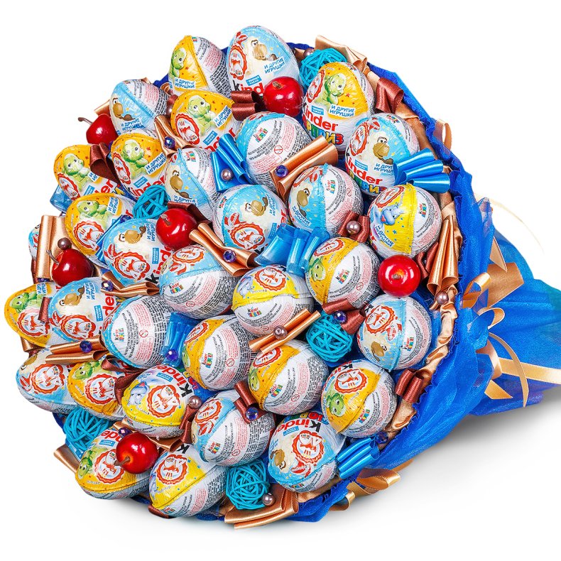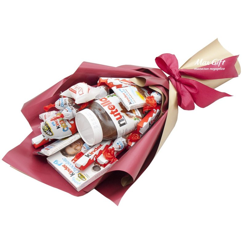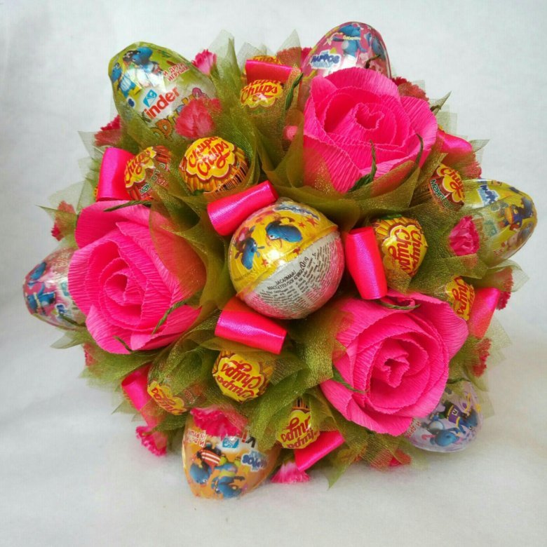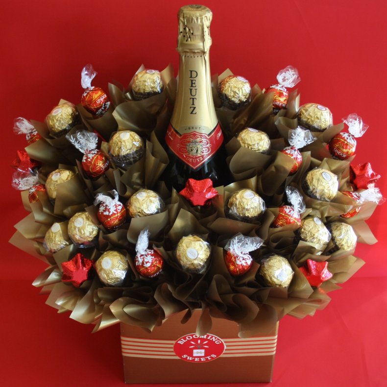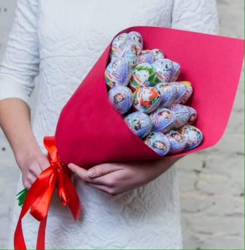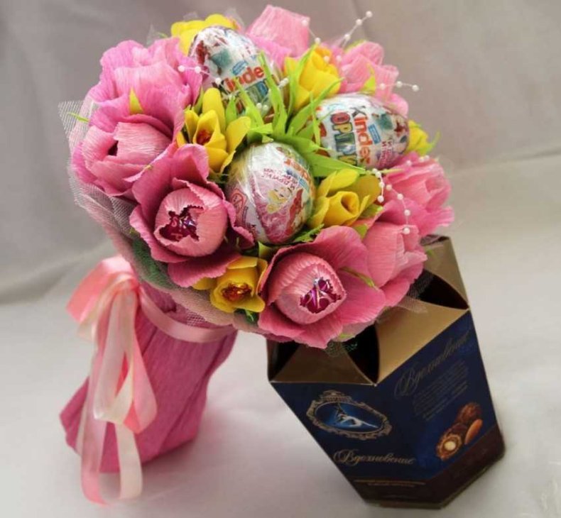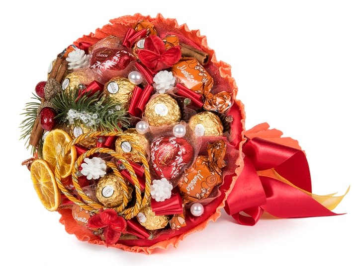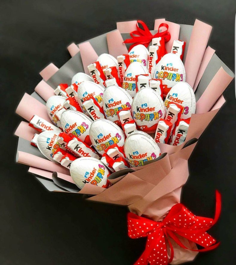 В такой ситуации универсальным презентом остается сладкий букет, поскольку он не только радует глаз и украшает помещение, но и становится отличным угощением.