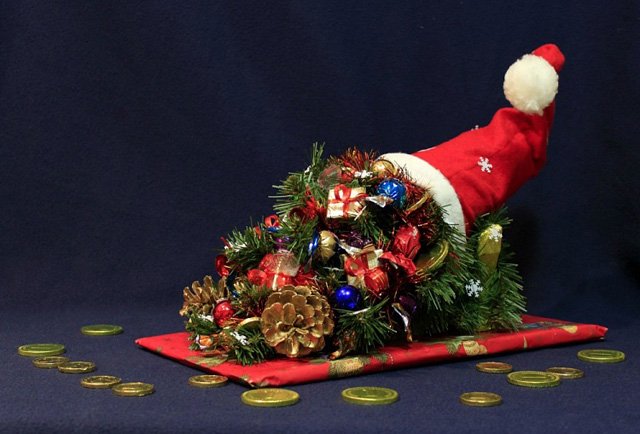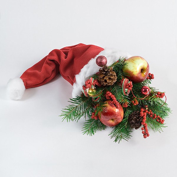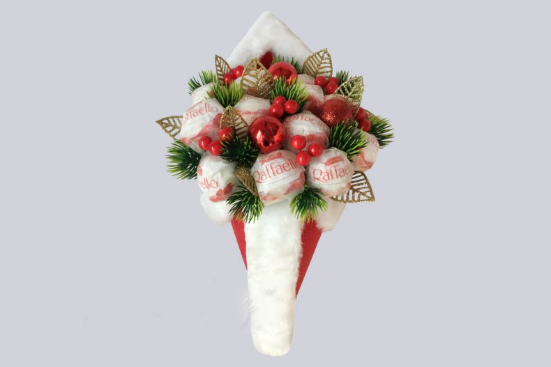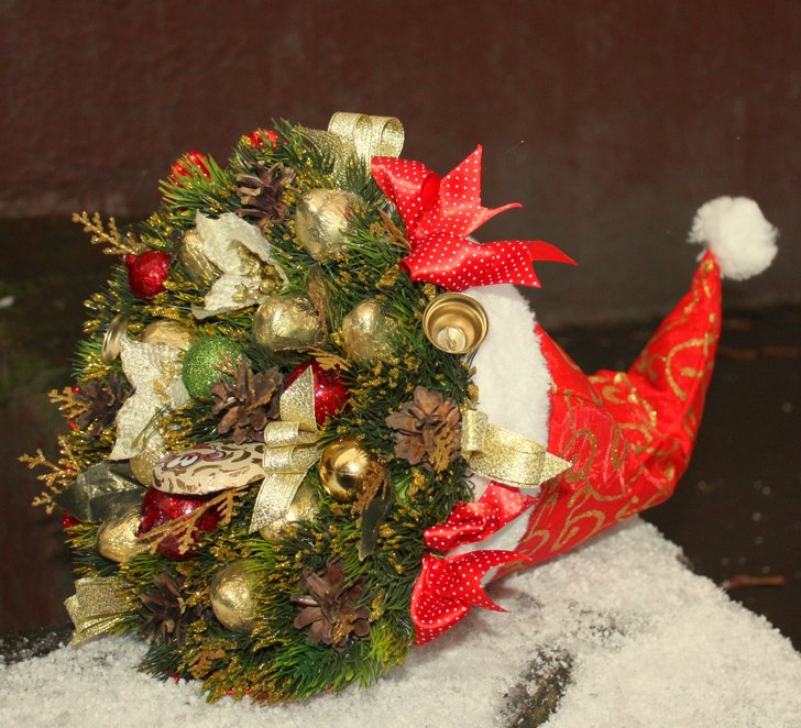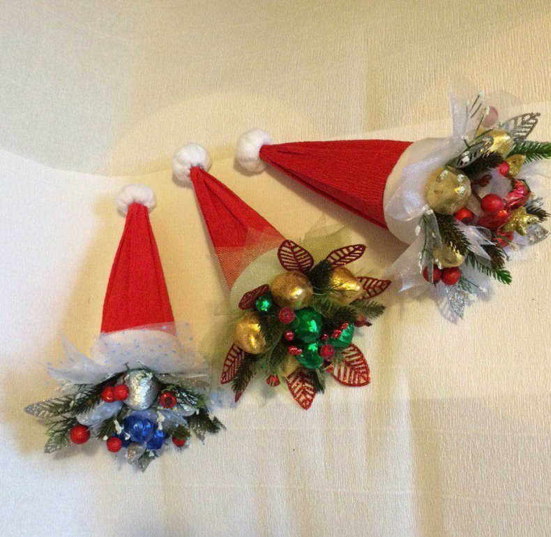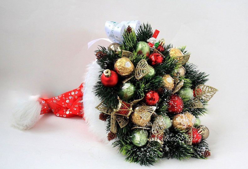 - Получившийся колпак Санта Клауса изнутри наполнить конфетами, украсив цветами, новогодними игрушками, еловыми веточками либо другими украшениями.