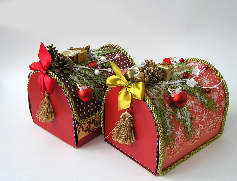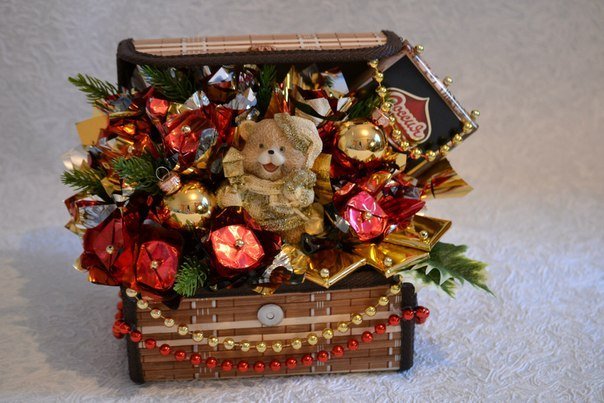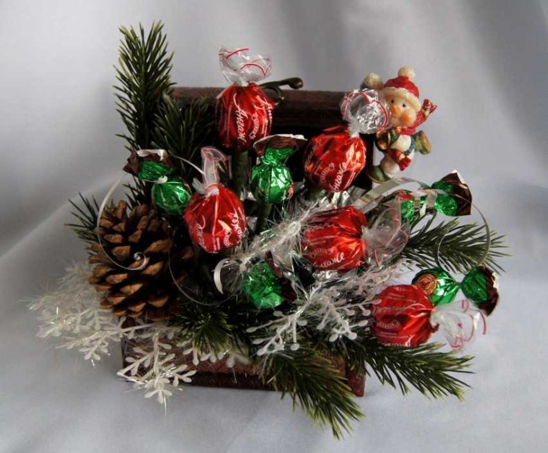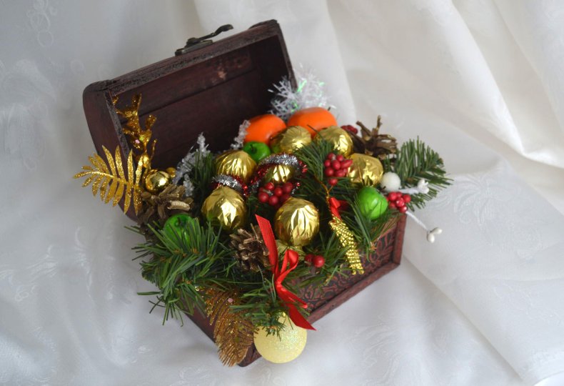 Для него потребуется декоративный сундучок (можно приобрести в отделе подарков или во флористическом магазине), еловые веточки, цветы (желательно розы), конфеты, пенопласт, ленты, новогодние шары и другие украшения по вкусу.