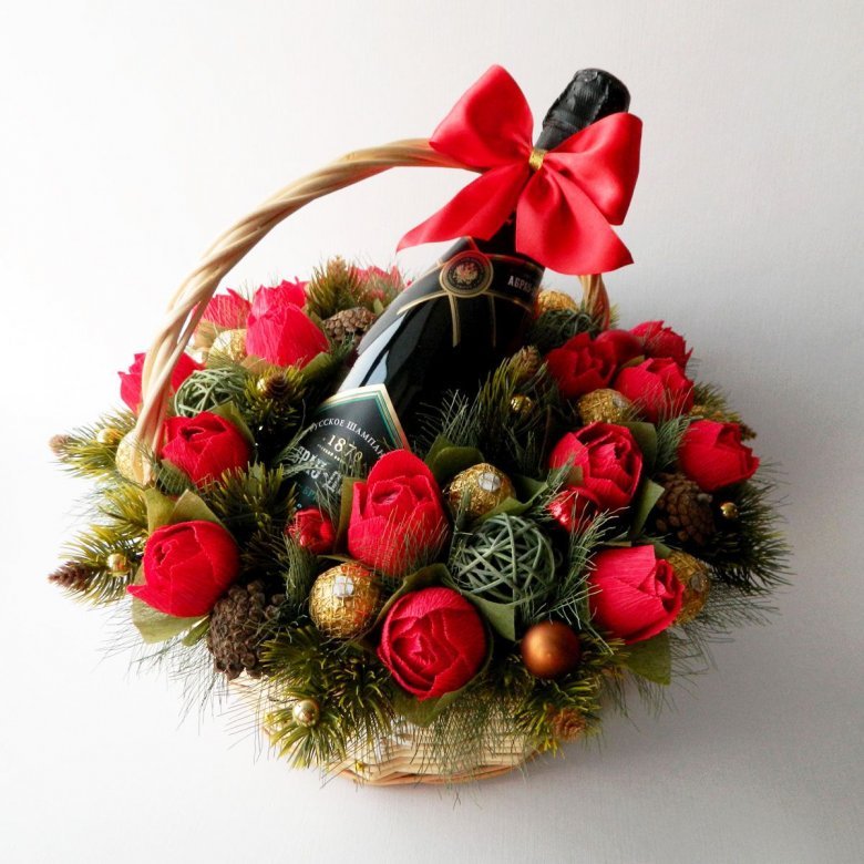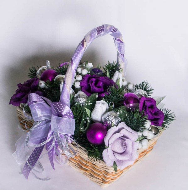 Для такого букета потребуются: корзинка, ленты, флористическая сетка либо похожая на нее ткань, зеркальная цветная бумага, конфеты, еловые ветви, шишки, краска и другой декор по вкусу.
