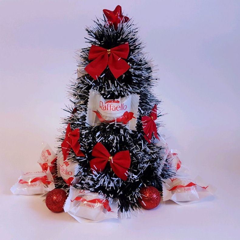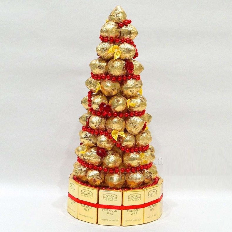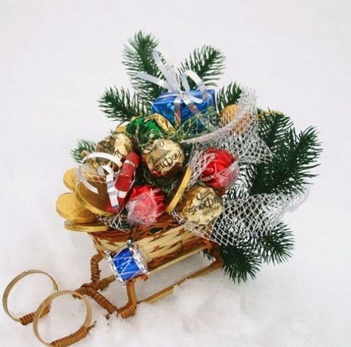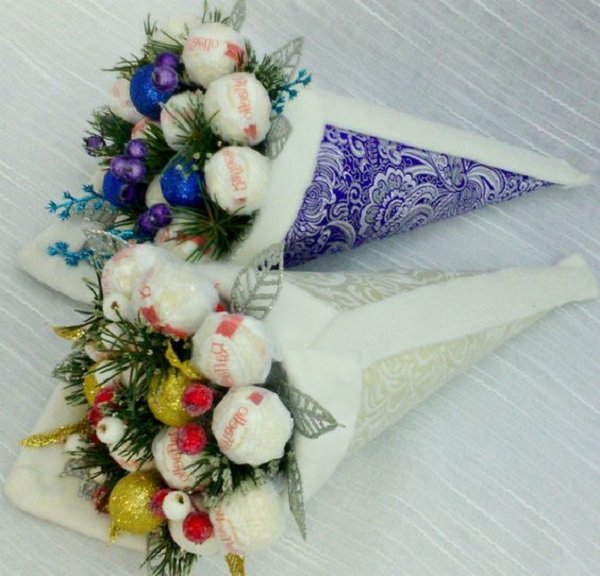 Такой способ создания сладкой композиции не очень сложный, но смотрится оригинально. Получившейся поделкой можно украсить новогодний стол либо презентовать подруге, коллеге, родственникам или знакомым.