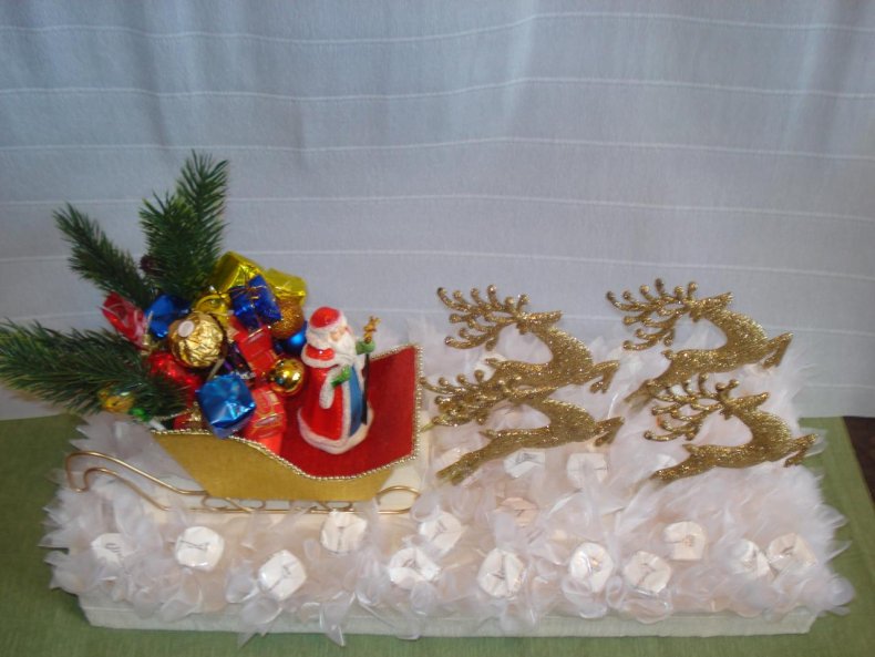 Для нее потребуется фигурка Деда Мороза, а также декоративные сани, конфеты, ветки ели, елочные декорации.