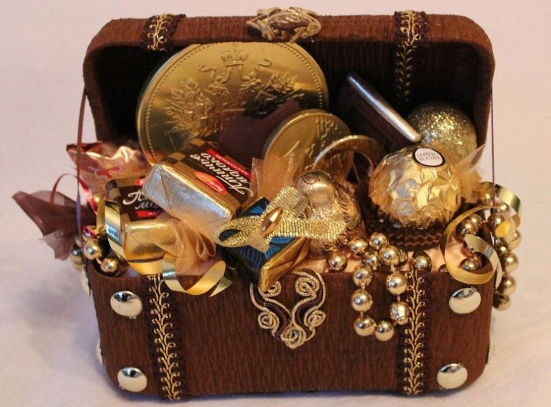 Конфеты обернуть в ленты и прикрепить к длинной шпажке при помощи скотча. Пенопласт (можно использовать губку) положить на дно сундука и воткнуть в него конфеты на шпажках и цветы.