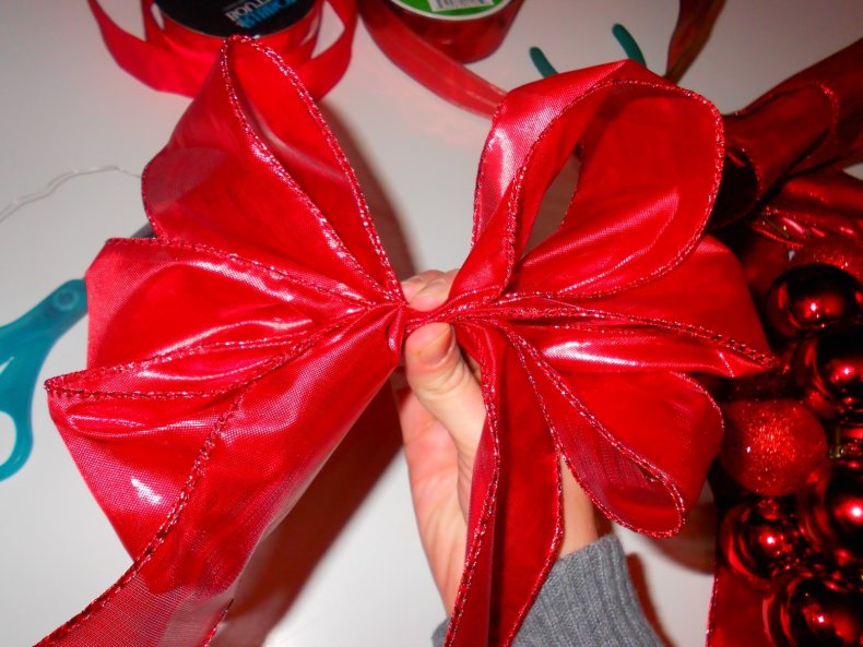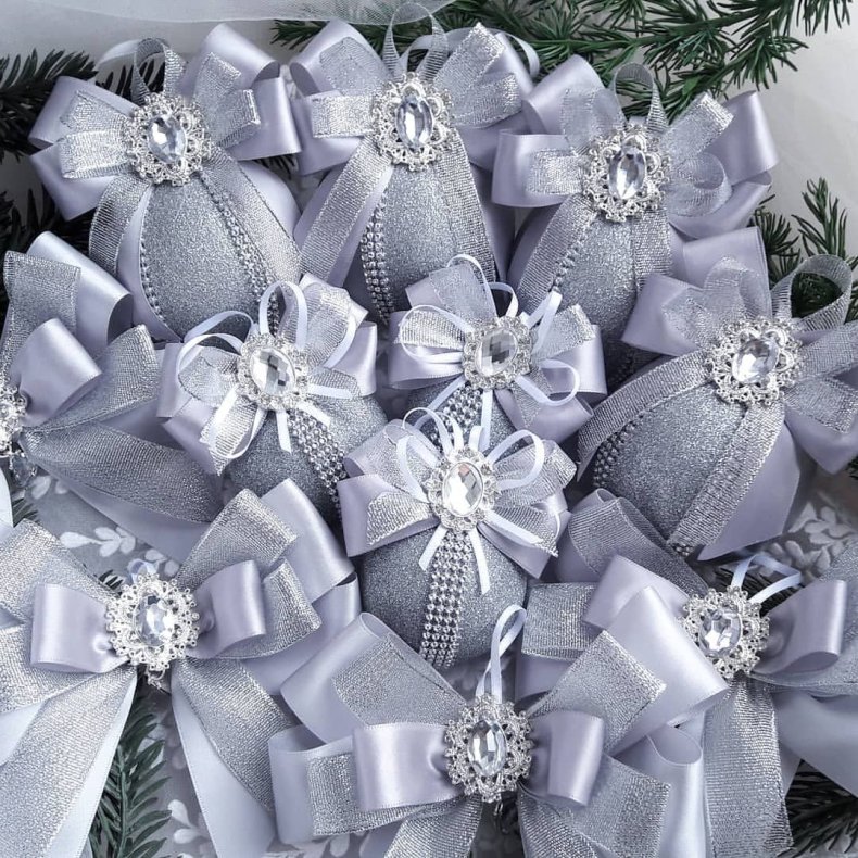 Очень просто и быстро можно изготовить красивый елочный шарик из бантиков, которые можно купить готовыми или сделать самостоятельно.