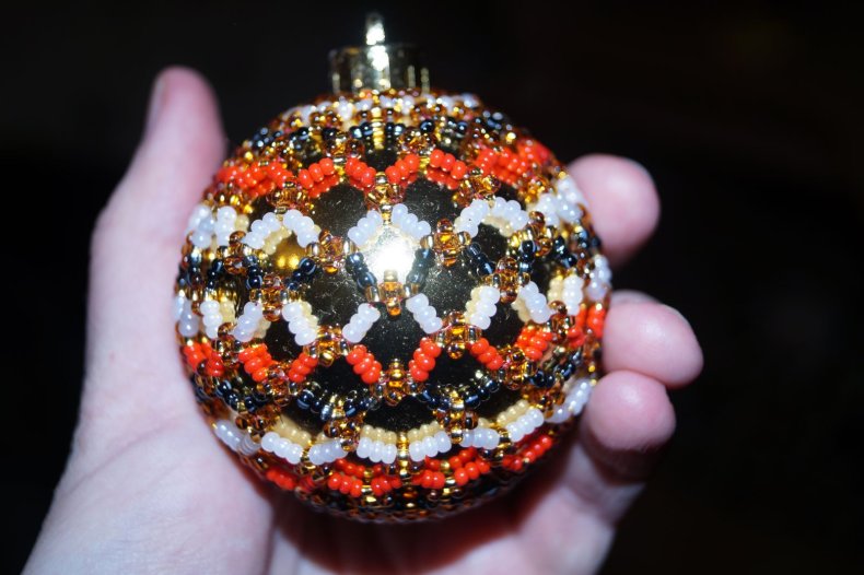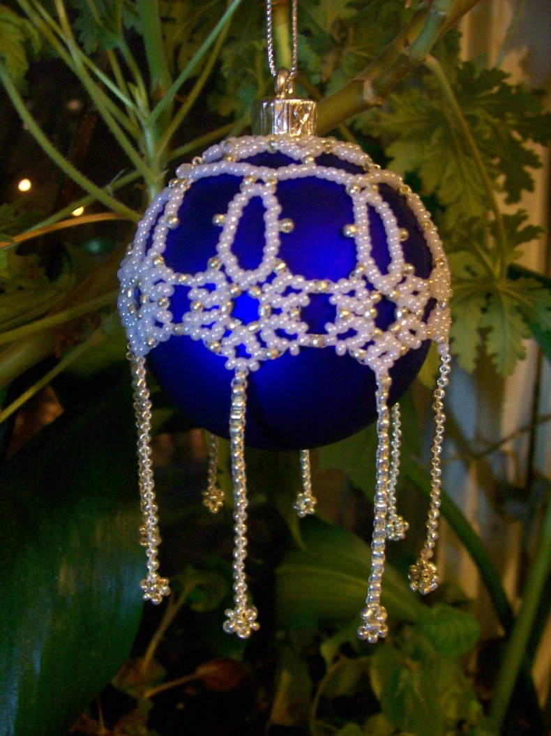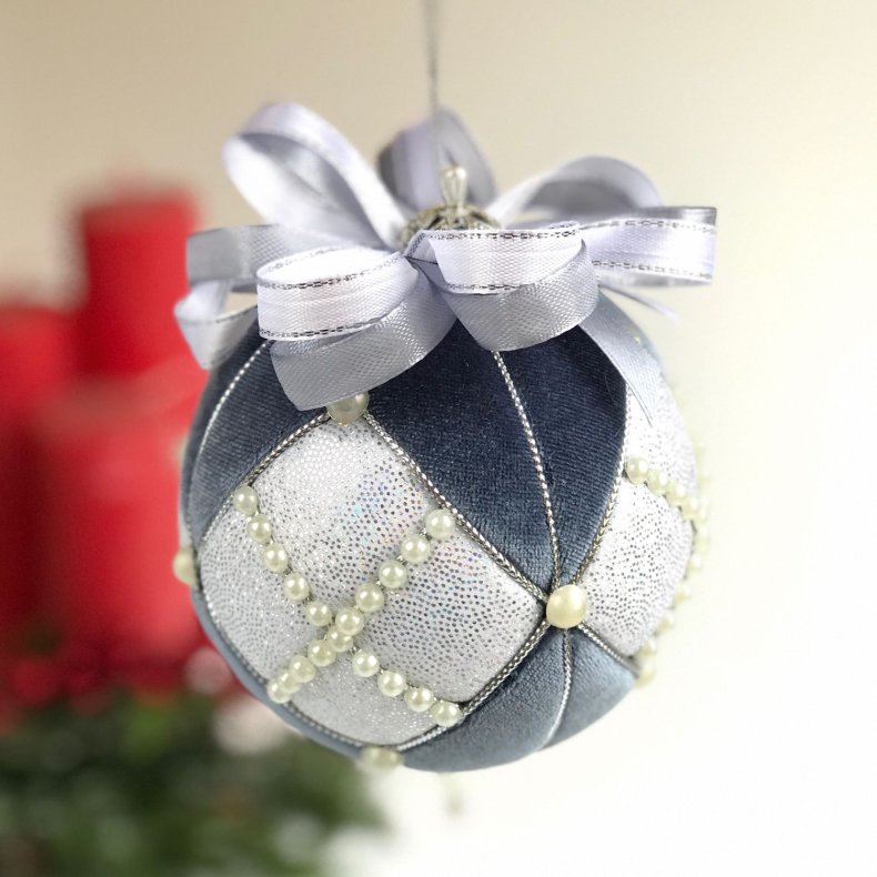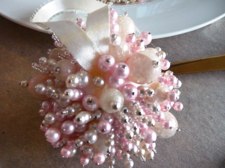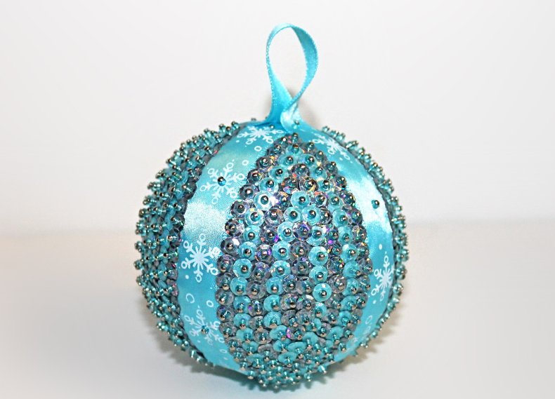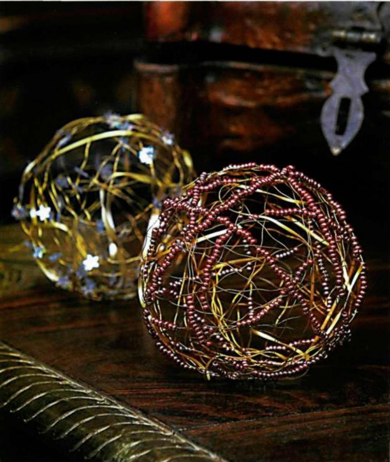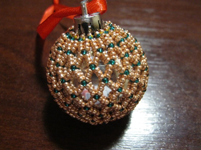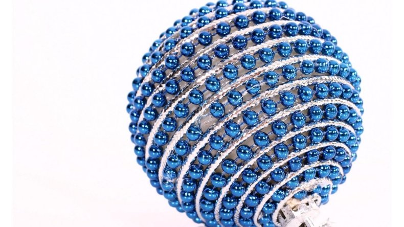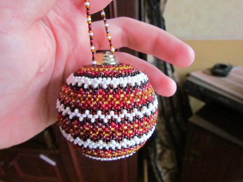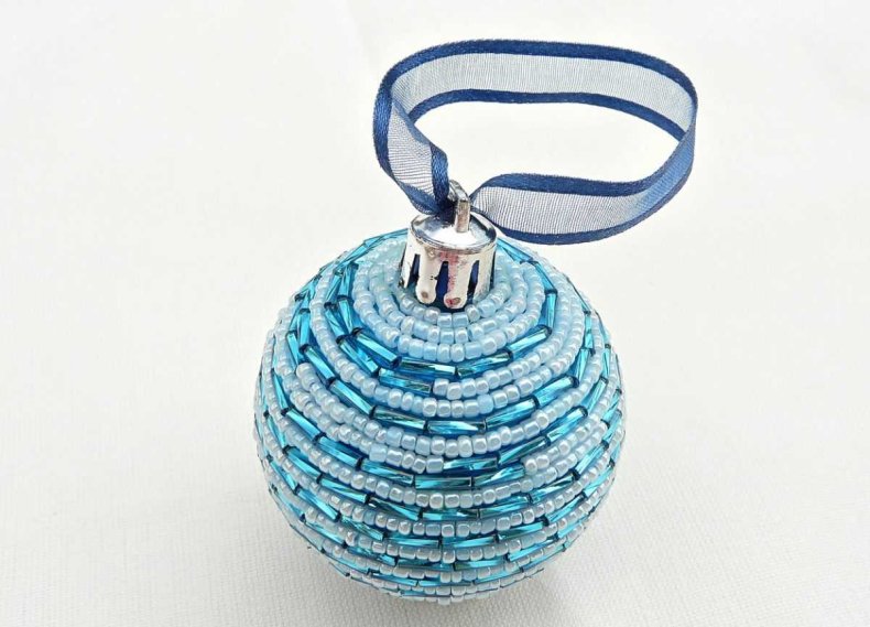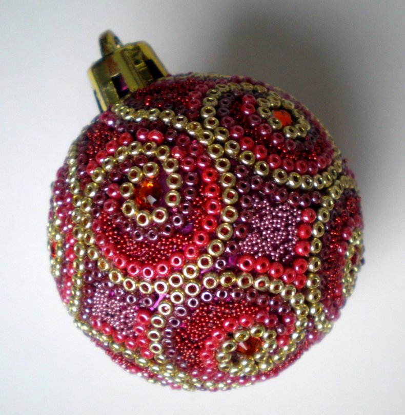 Можно использовать бусинки разных оттенков или использовать однотонные, например жемчужные. Декор шара при необходимости дополняется золотистыми или серебряными нитями.