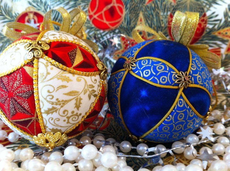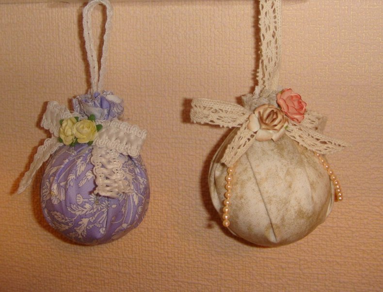 Ненужным остаткам различных тканей и тюлю умелый мастер подарит новую жизнь, украсив ими новогодние игрушки.