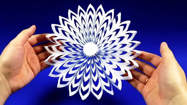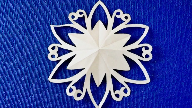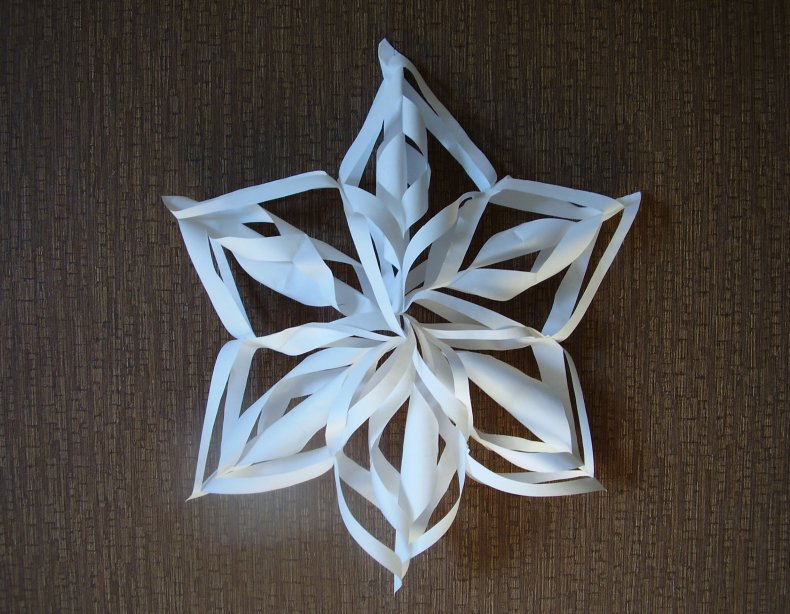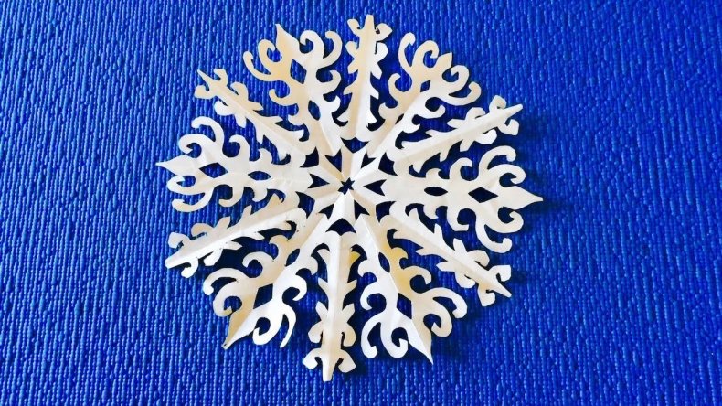 - Полученное изделие разворачивается, расправляются линии сгиба. В результате получается красивая снежинка.