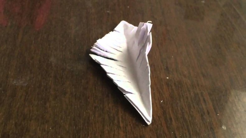 - Полученная фигура складывается в остроугольный треугольник, который напоминает игрушечный самолетик.