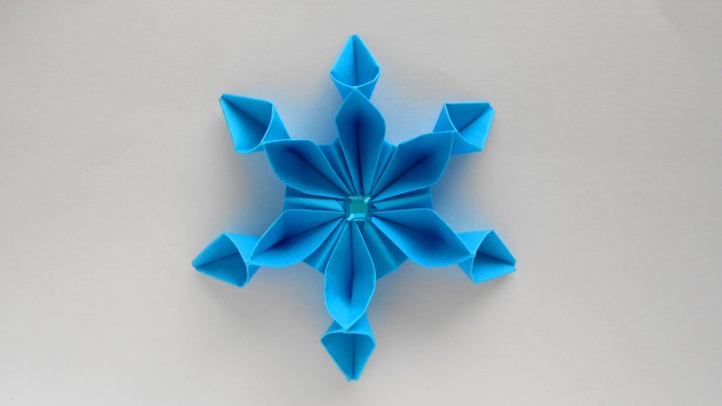 - Верхние листки сгибаются в разные стороны. В результате получается бумажный модуль снежинки. Оставшиеся элементы из голубой бумаги в количестве пяти штук изготавливаются, следуя предыдущим этапам.